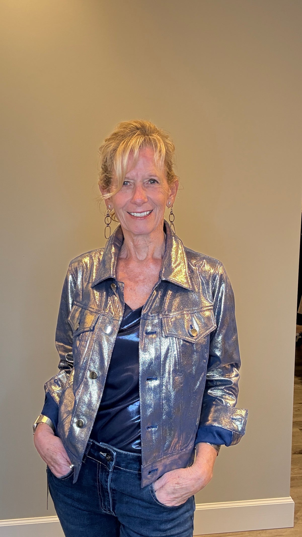Metallic Blue Vegan Leather Jacket with Edgy Hardware and Sleek Seaming