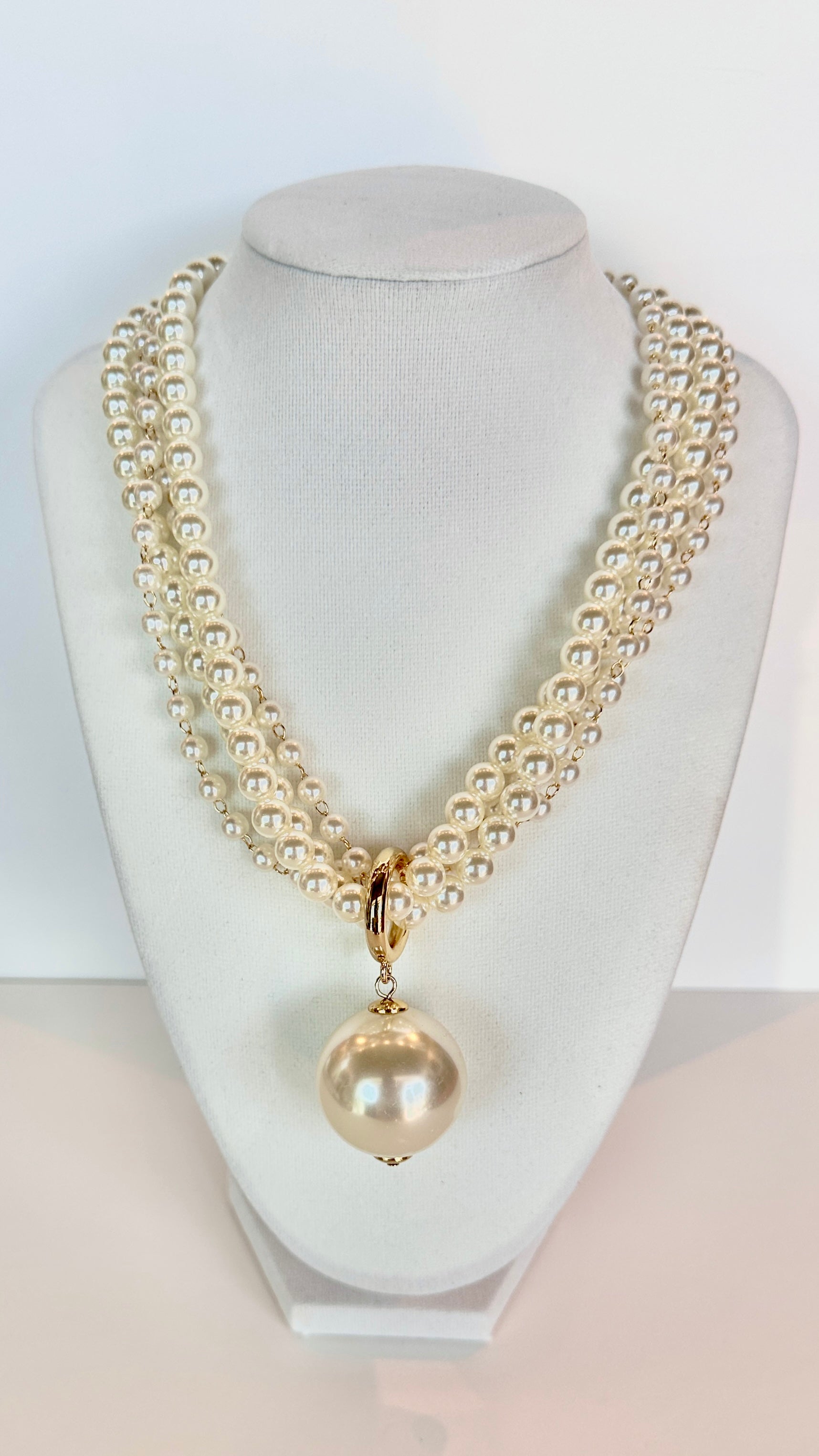 4 strand pearl necklace with large pearl at end with gold accents. Large pearl hanging off of gold ring and it is a short necklace that can be adjusted.
