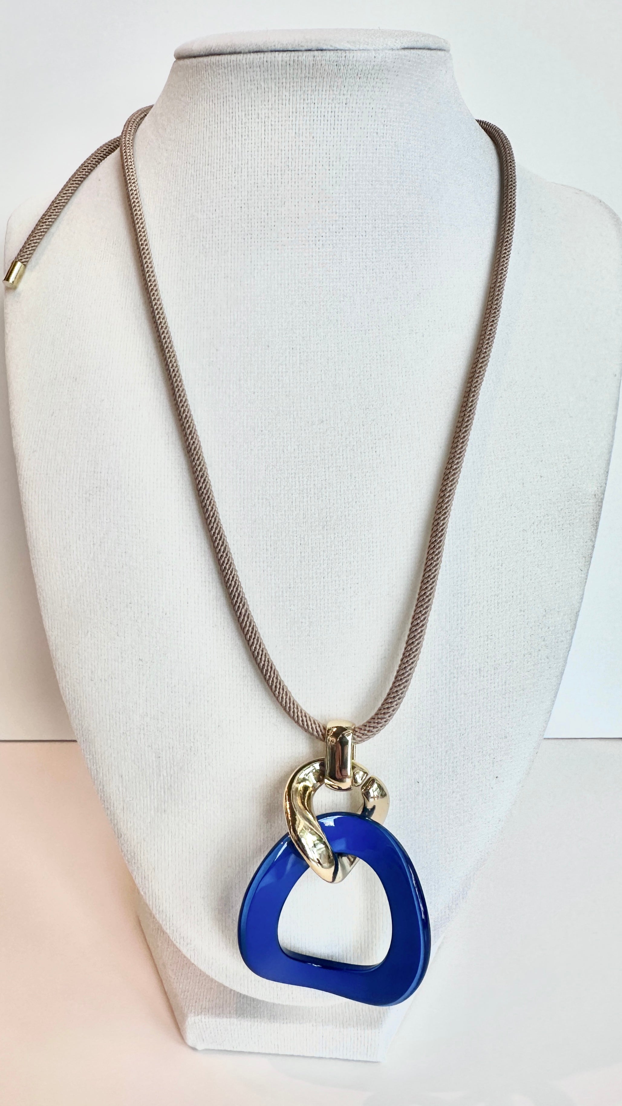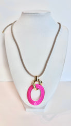 A modern statement piece with earthy elegance, this curved oval pendant is crafted from smooth resin and suspended from a light camel colored cord. Gold hardware accents add a touch of shine while the adjustable cord allows for customizable length.
