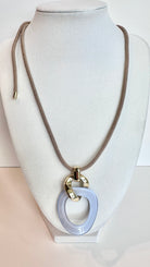 Curved Resin Oval Pendant Necklace with Gold Accents and Adjustable Camel Color Cord