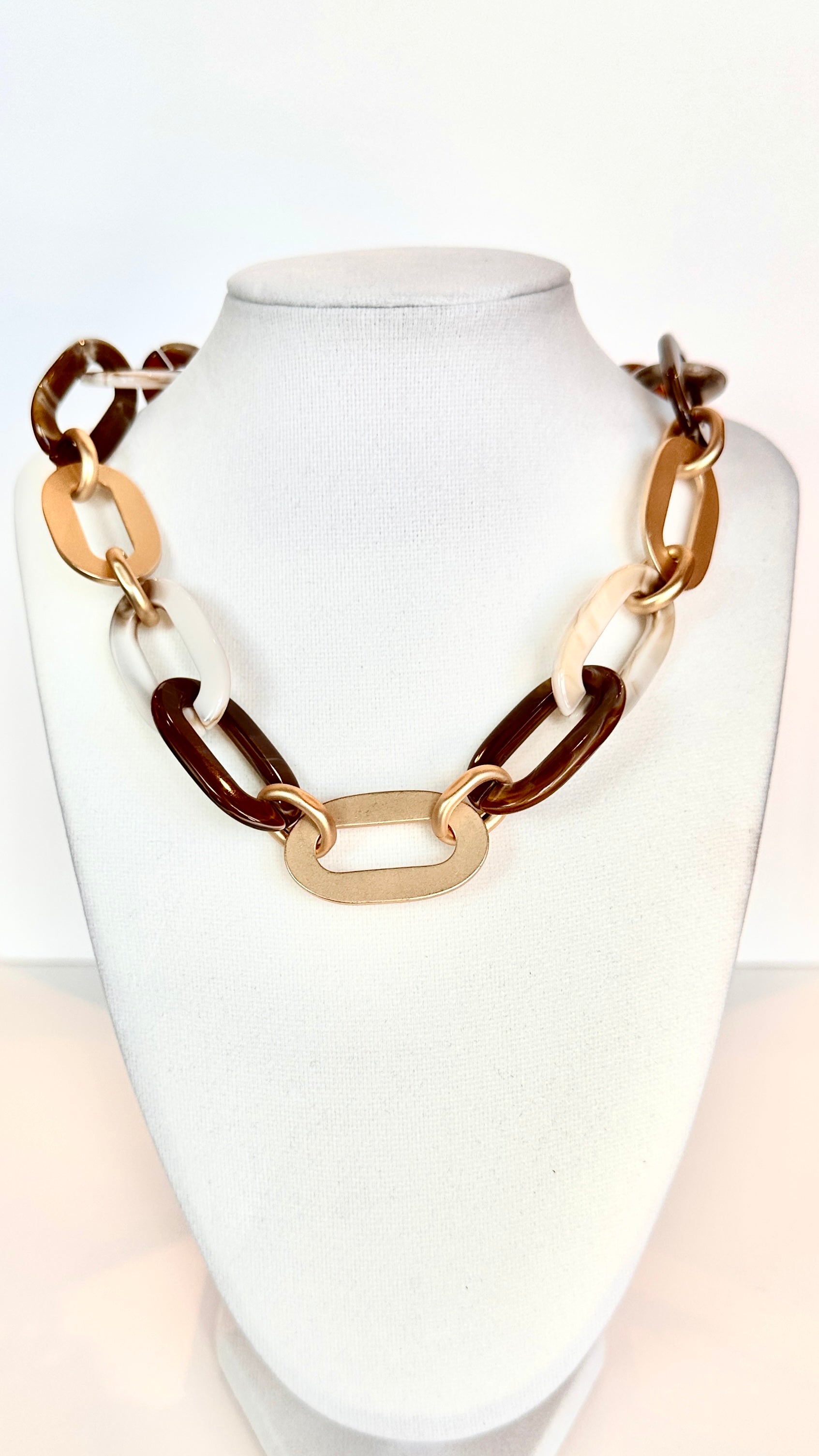 Short necklace featuring marbled beige resin and matte gold links on an adjustable chain with a lobster clasp, perfect for layering or wearing solo.