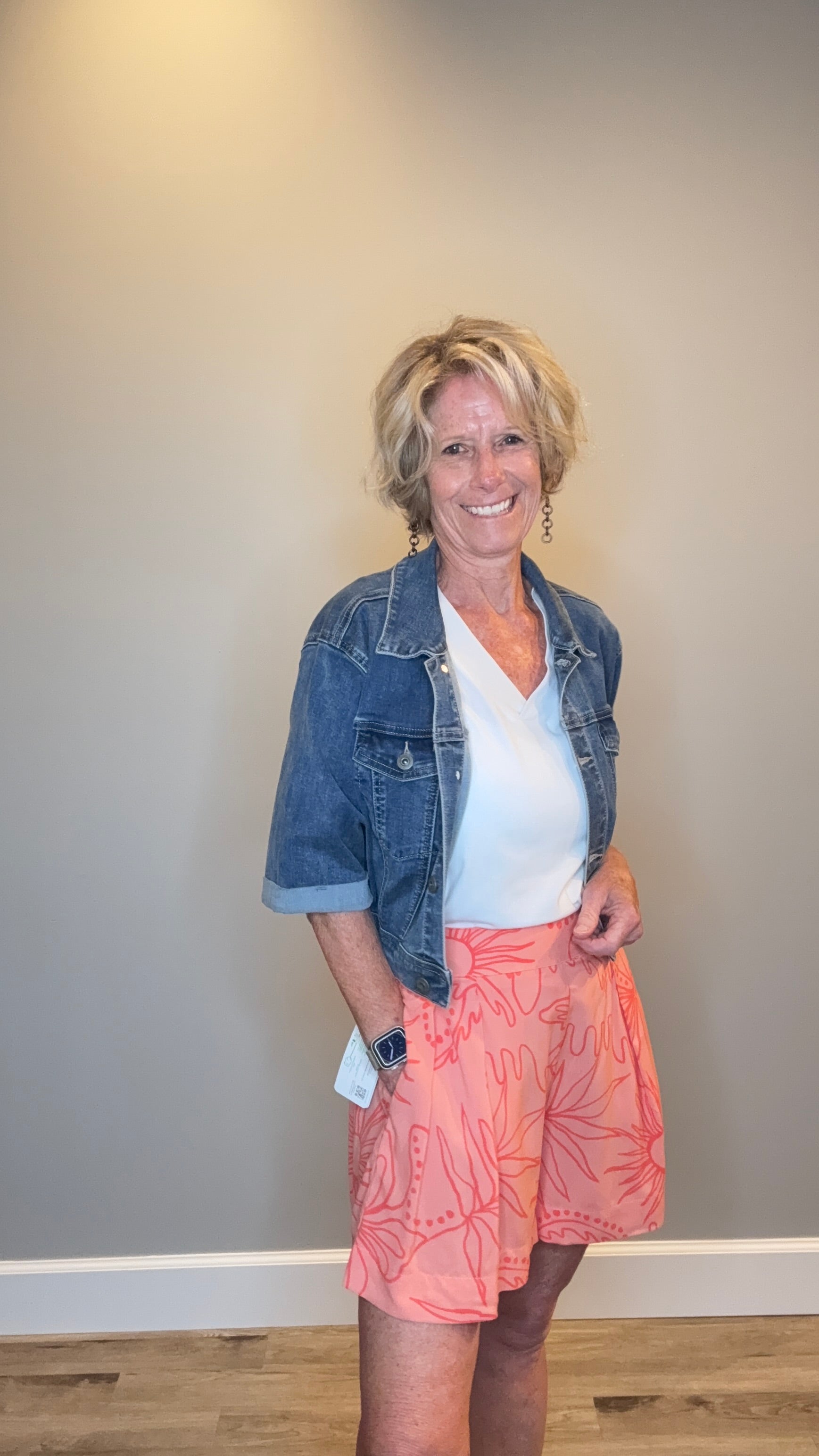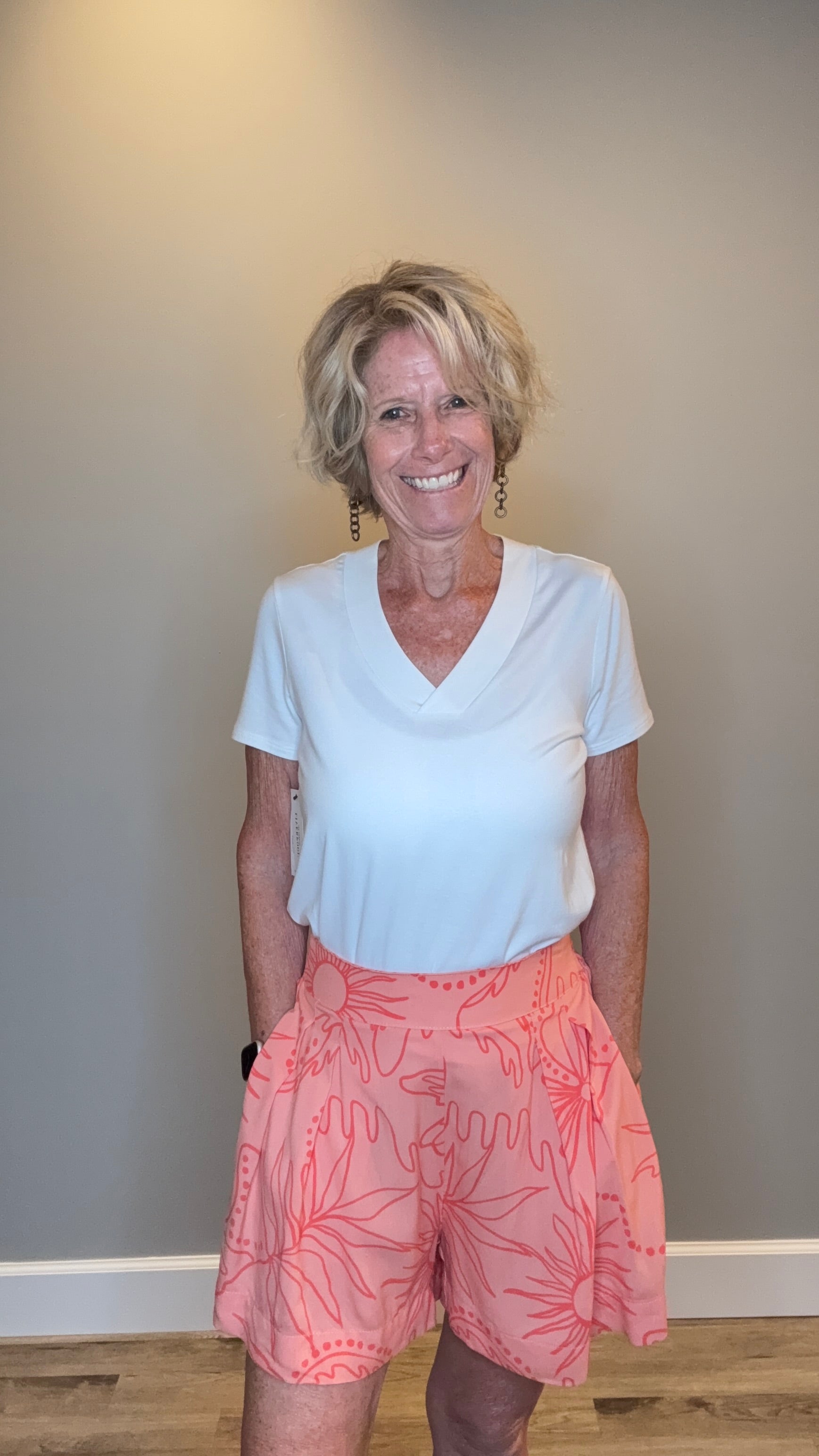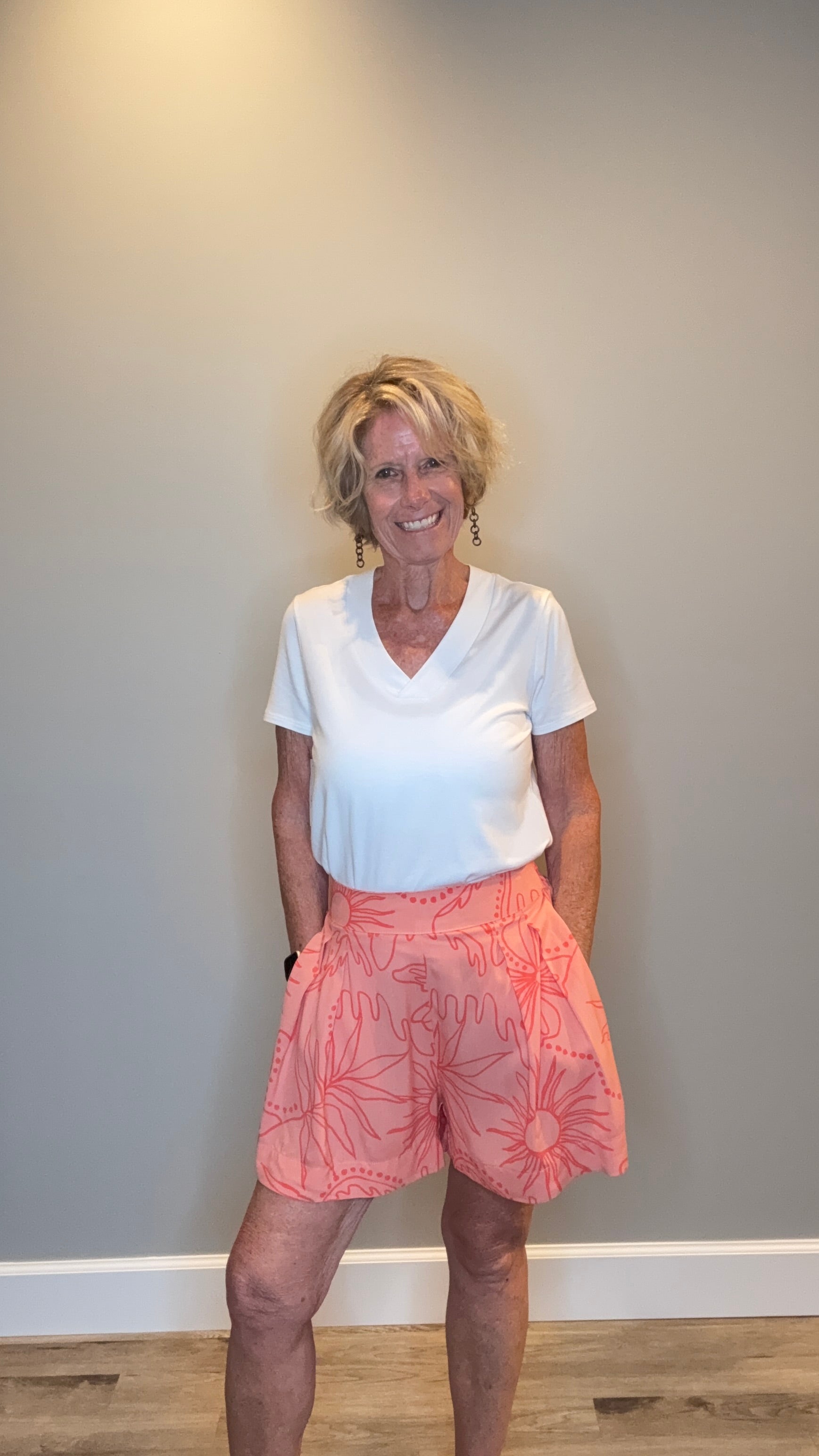 Effortless and versatile, these flat front shorts feature soft pleats and discreet side seam pockets for a clean, polished look. The elasticized back waistband adds comfort while keeping the front smooth and flattering. Crafted in a lightweight fabric with a subtle tonal print, they bring depth and modern sophistication to your transitional wardrobe.