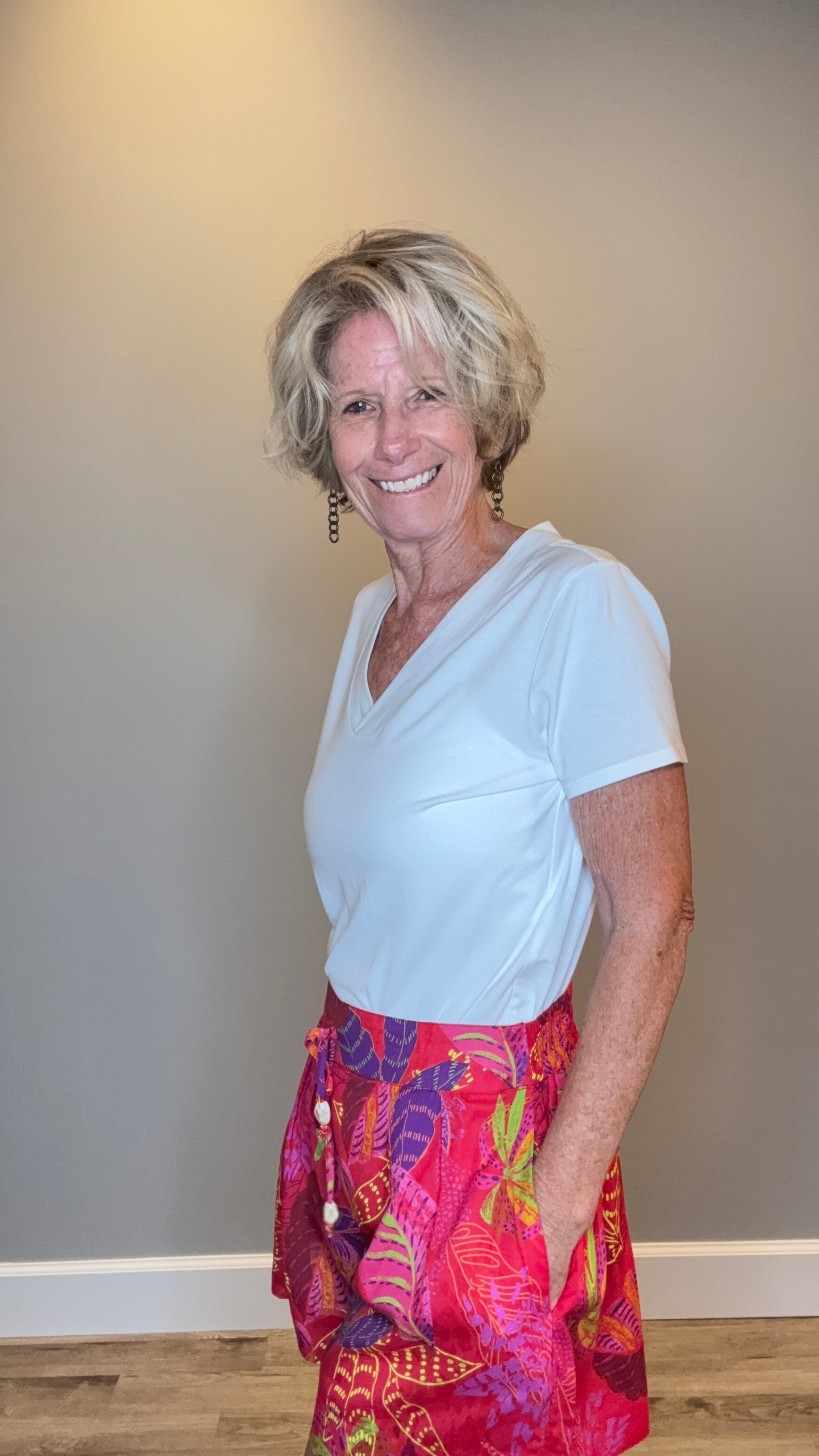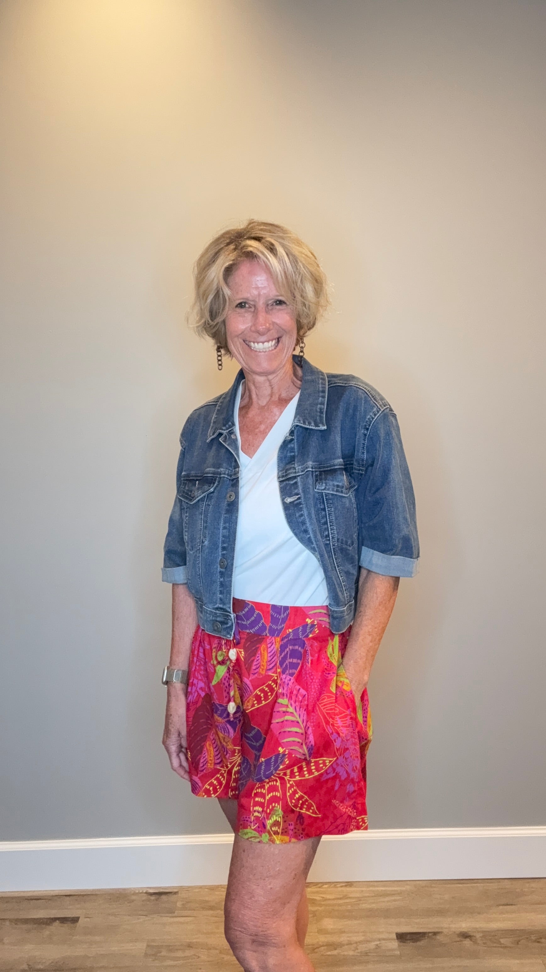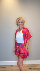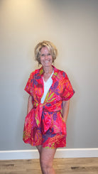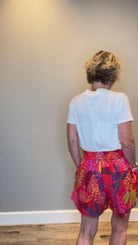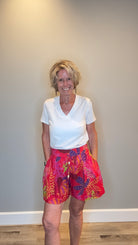 Make a bold statement in these flat front shorts designed with soft pleats and side pockets for effortless ease. A playful front tie is finished with resin marbled stone accents while the back elastic waistband ensures comfort without sacrificing style. Crafted in a lightweight fabric with a vibrant tango red print.