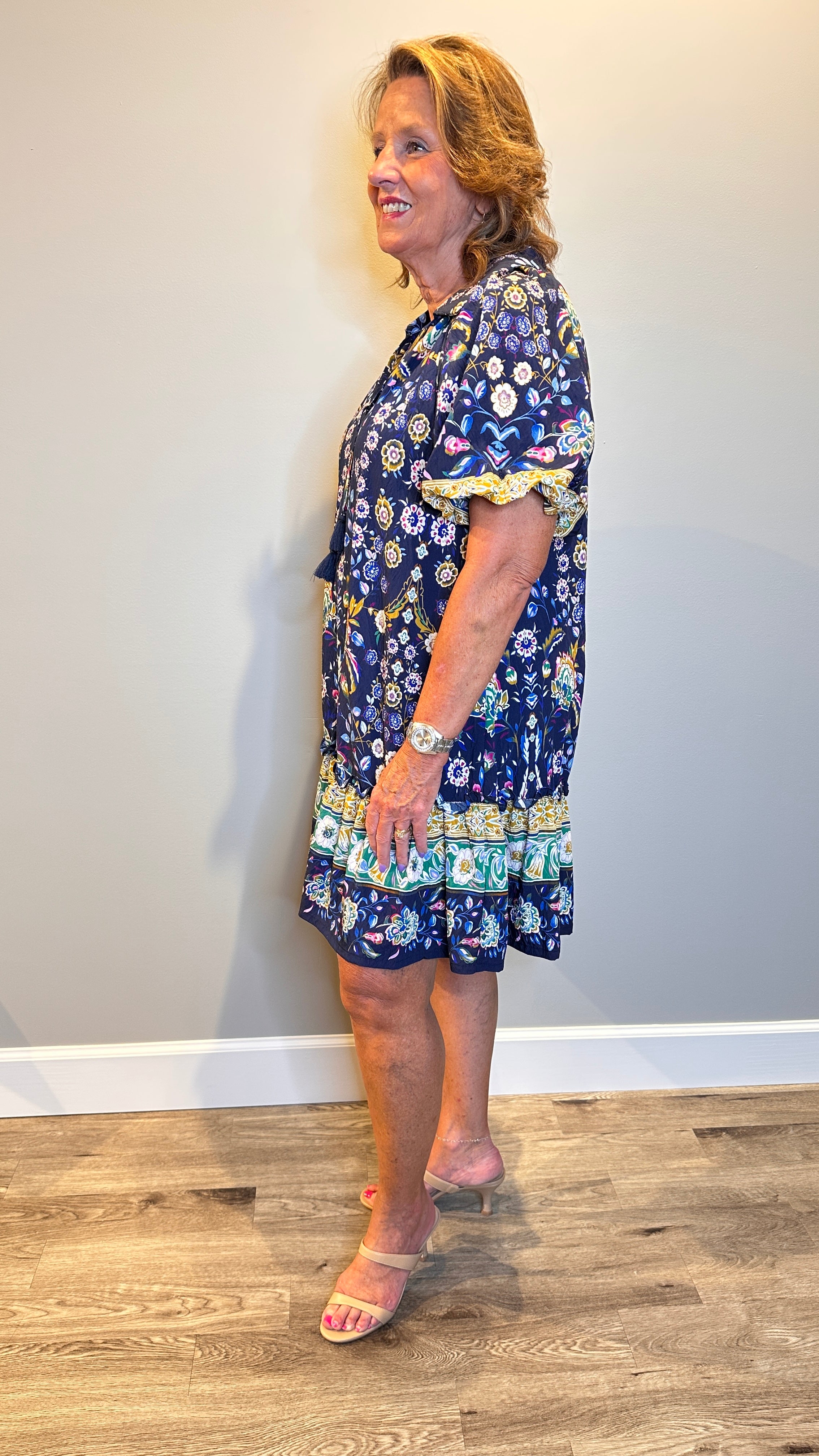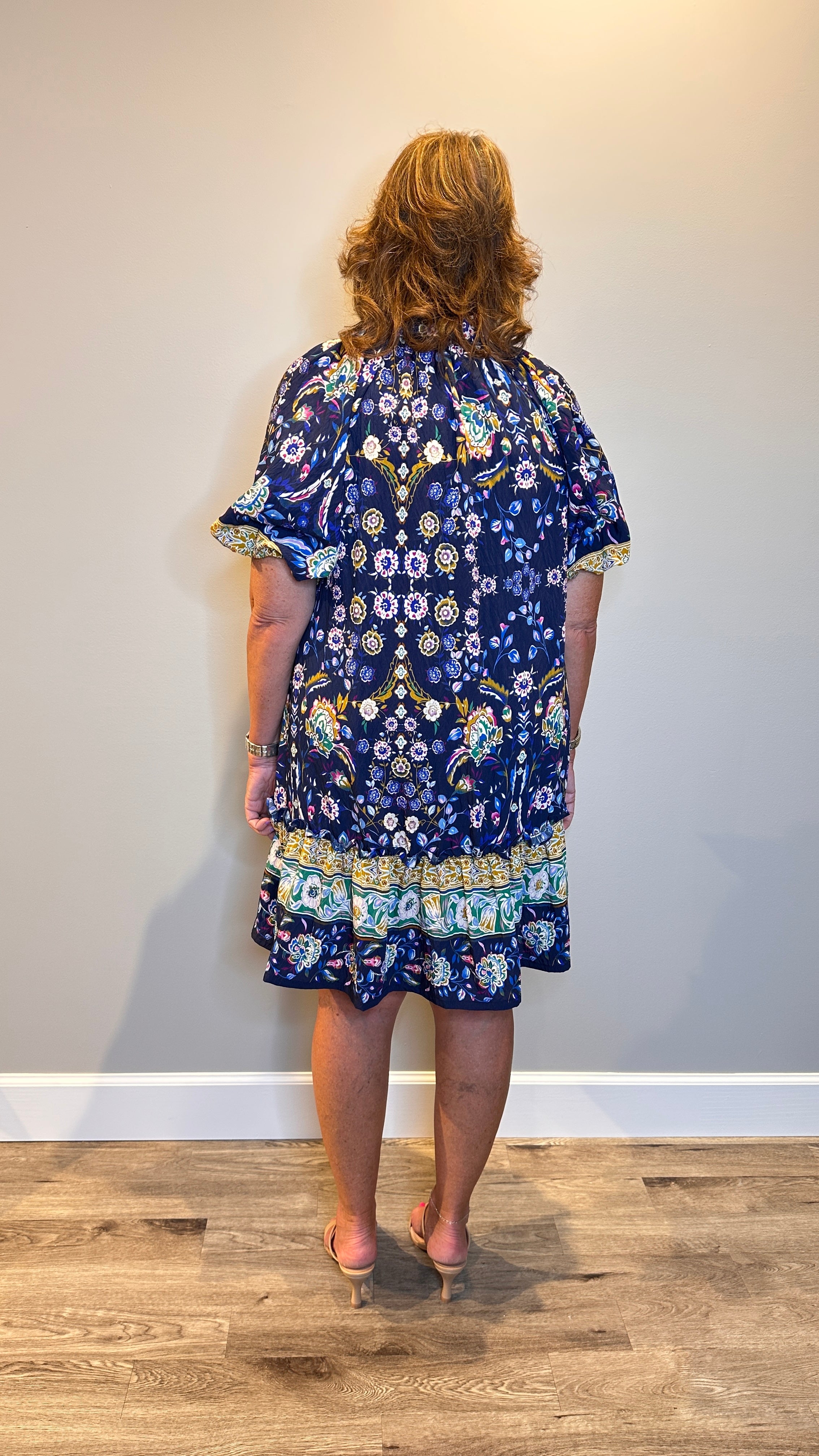 Embrace effortless bohemian style with this mixed print dress. Featuring playful bubble sleeves, a ruffle-trimmed collar and a flattering V-neckline with tasseled ties, it's full of charming details. The tiered silhouette moves making it perfect for anything from weekend markets to casual dinners.
