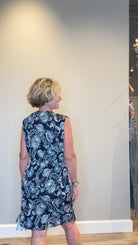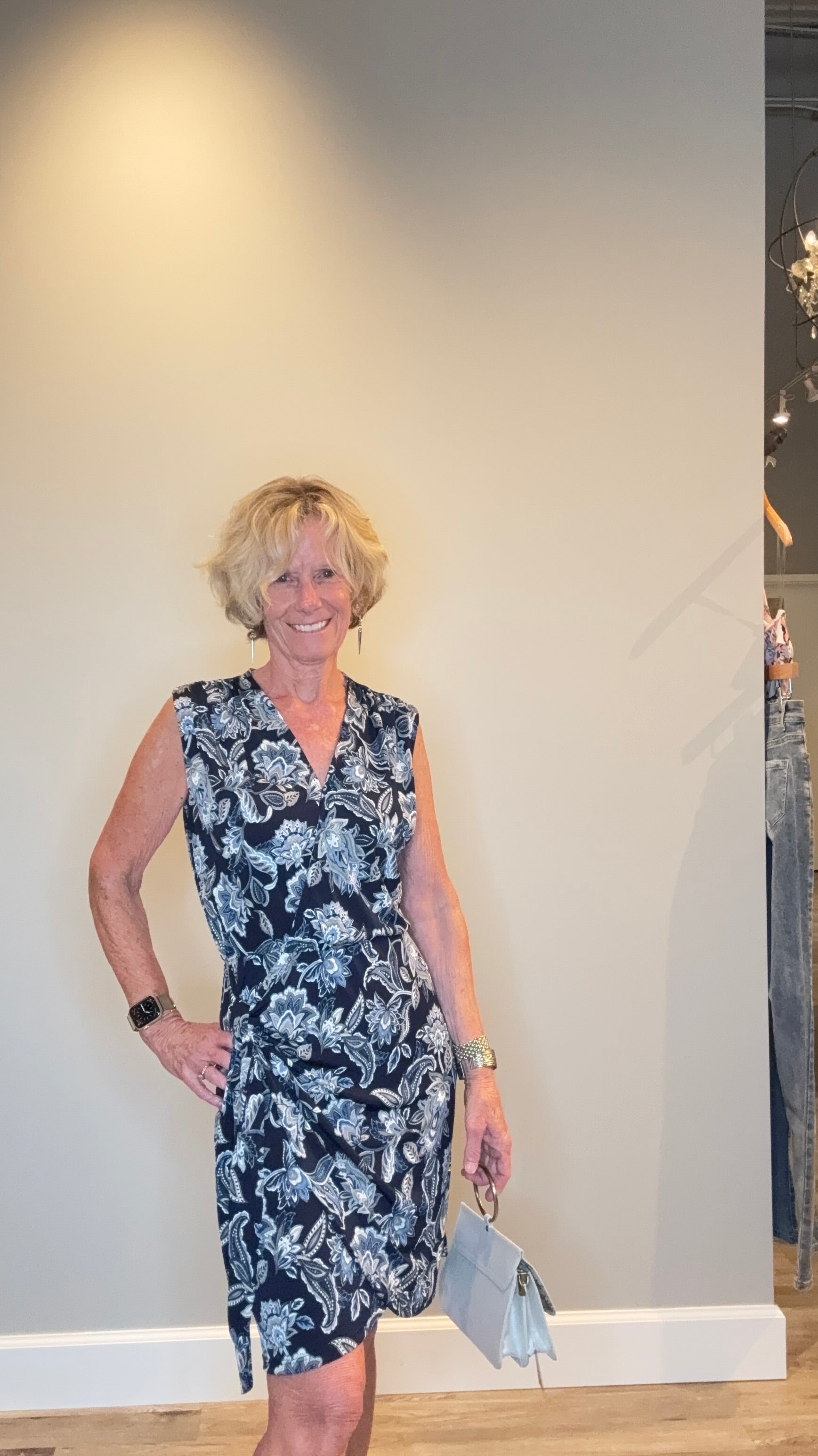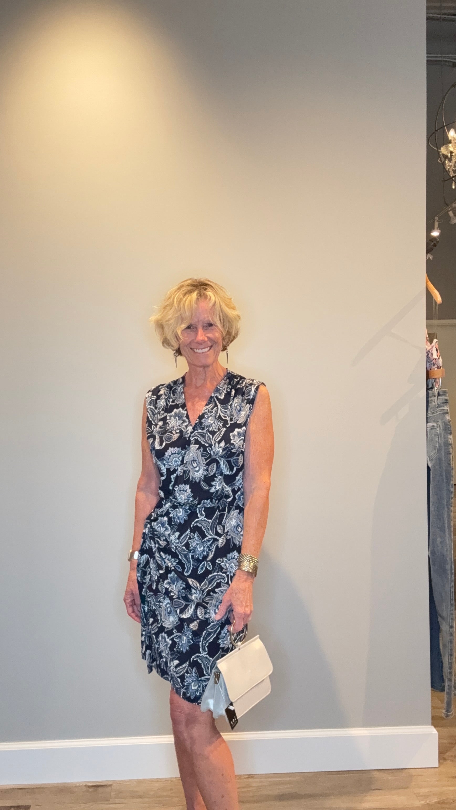 This sleeveless faux wrap dress combines effortless style with a universally flattering silhouette. The V-neckline and wrap inspired shape highlight the waist while providing comfort and ease. Finished in a rich navy with a floral puff print and paisley like leaf details, it's a perfect dress for workdays, weekends or special gatherings.