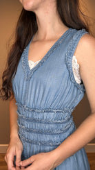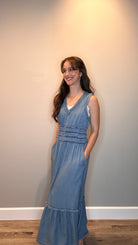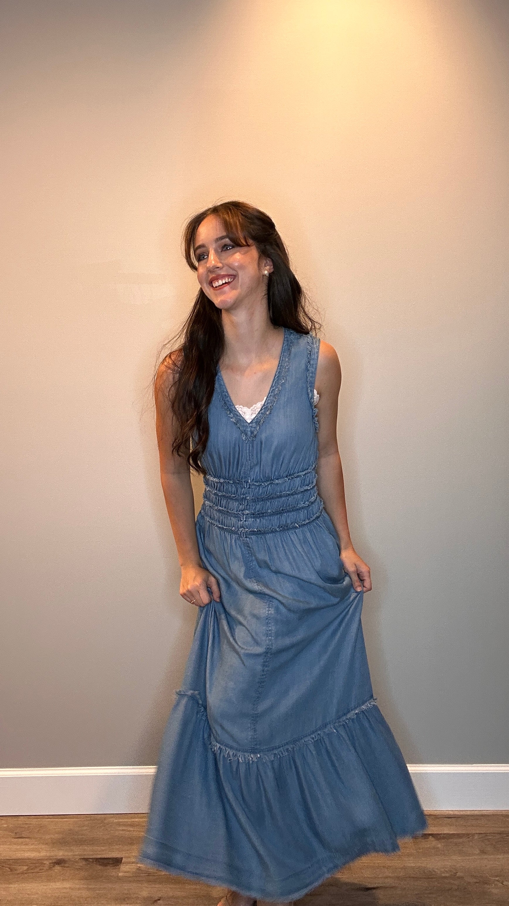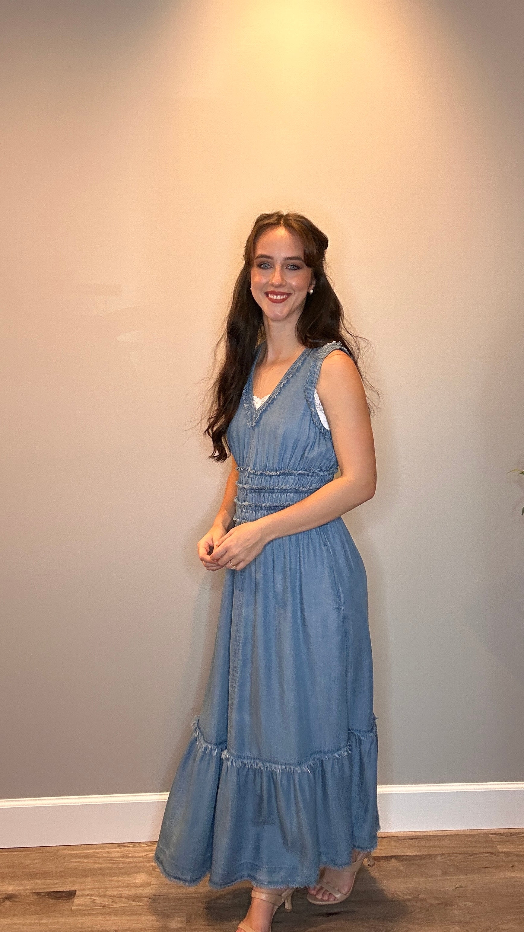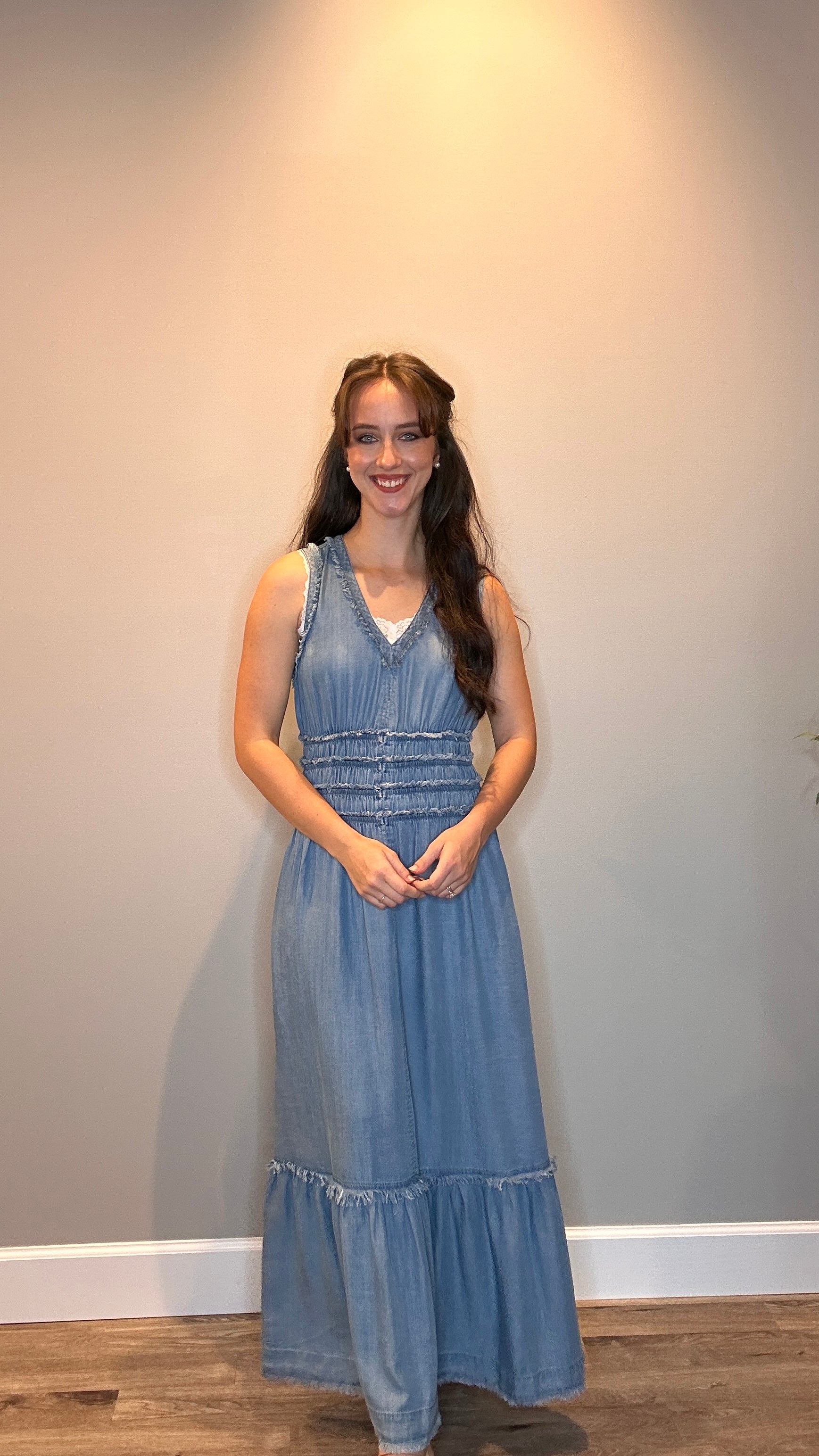 This tencel maxi dress is easy, breezy and endlessly wearable, making it a closet essential with a modern twist. Designed with a smocked bodice and flattering V-neckline, it offers a comfortable, figure-hugging fit up top with a soft, flowy drape through the skirt. Sleeveless frayed edges for a touch of casual charm and finished with side seam pockets for everyday ease.