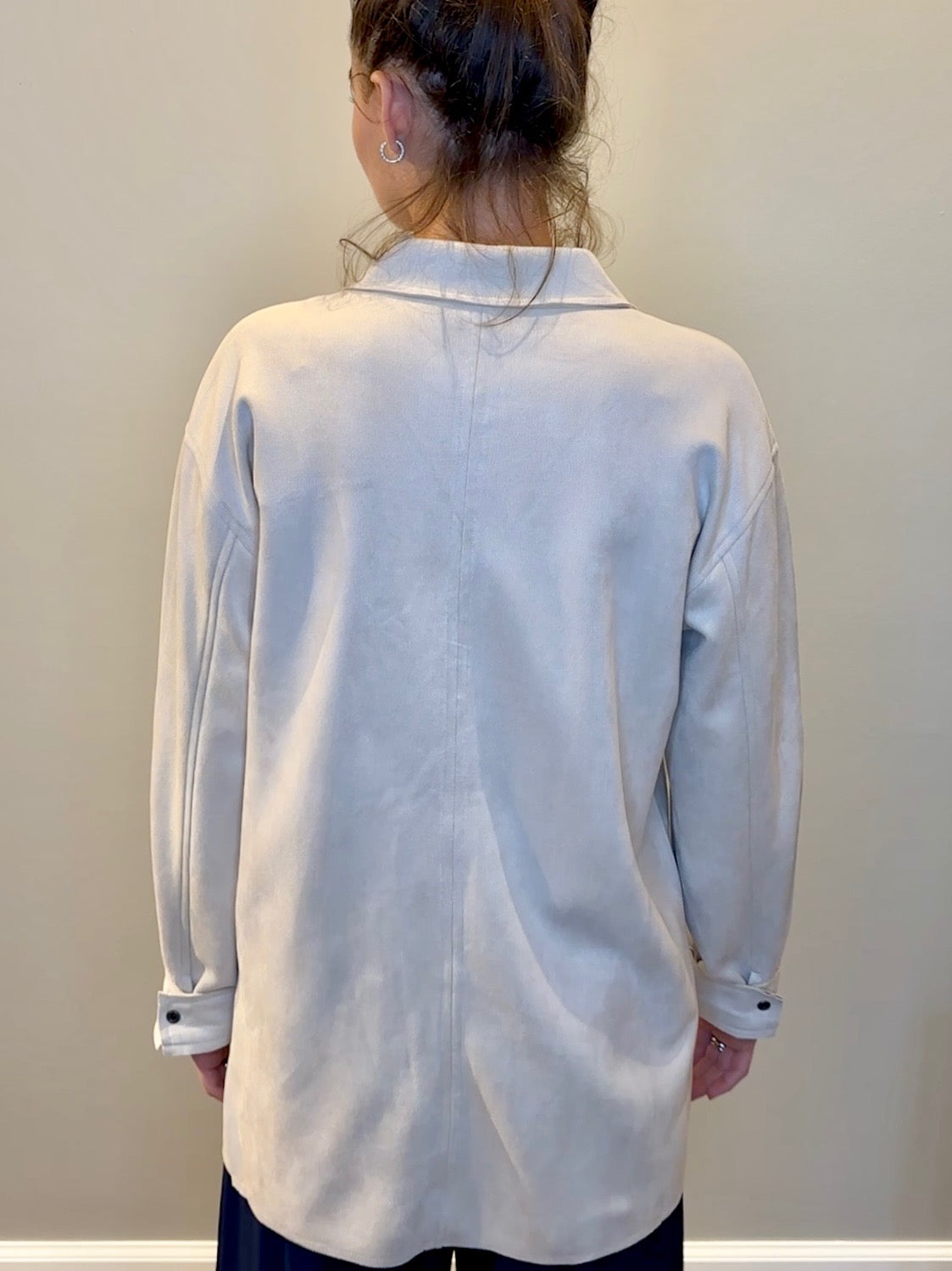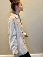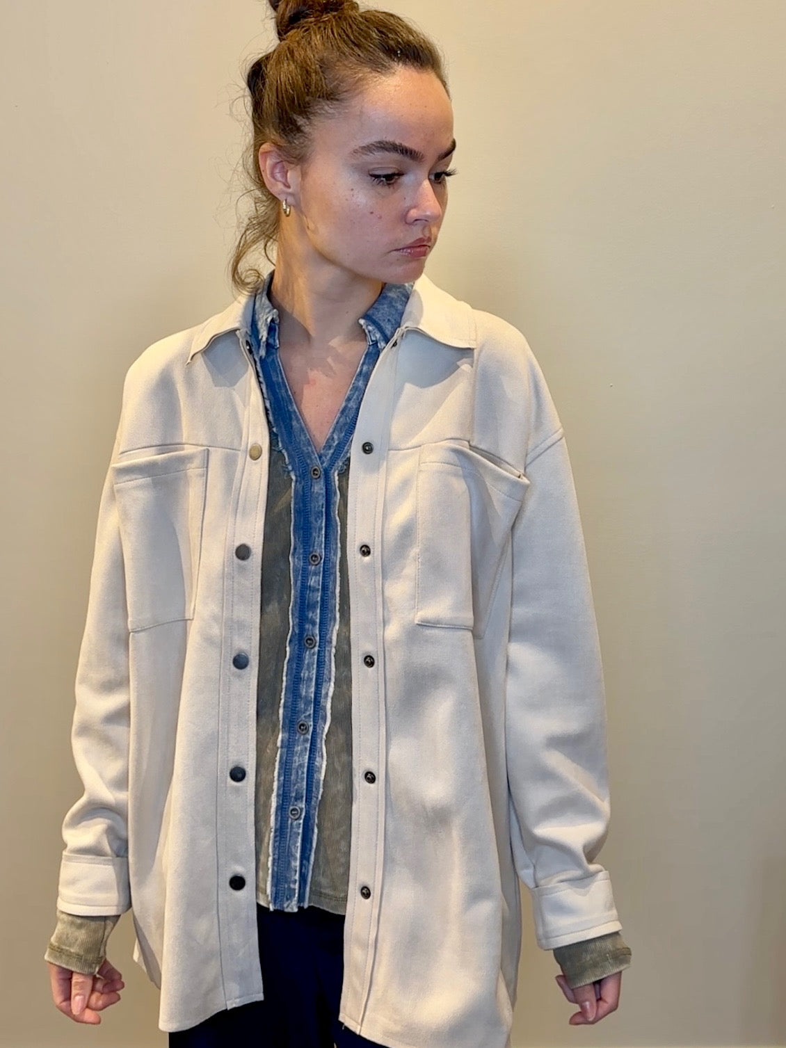 Refresh your layers with this butter soft suede shacket in a gorgeous cream tone. Designed with a modern raw edge finish, it features matte silver snaps down the front and the cuffs, plus functional chest pockets for utility with style. The clean lines and luxe texture make it the perfect balance of polish and ease.