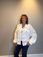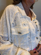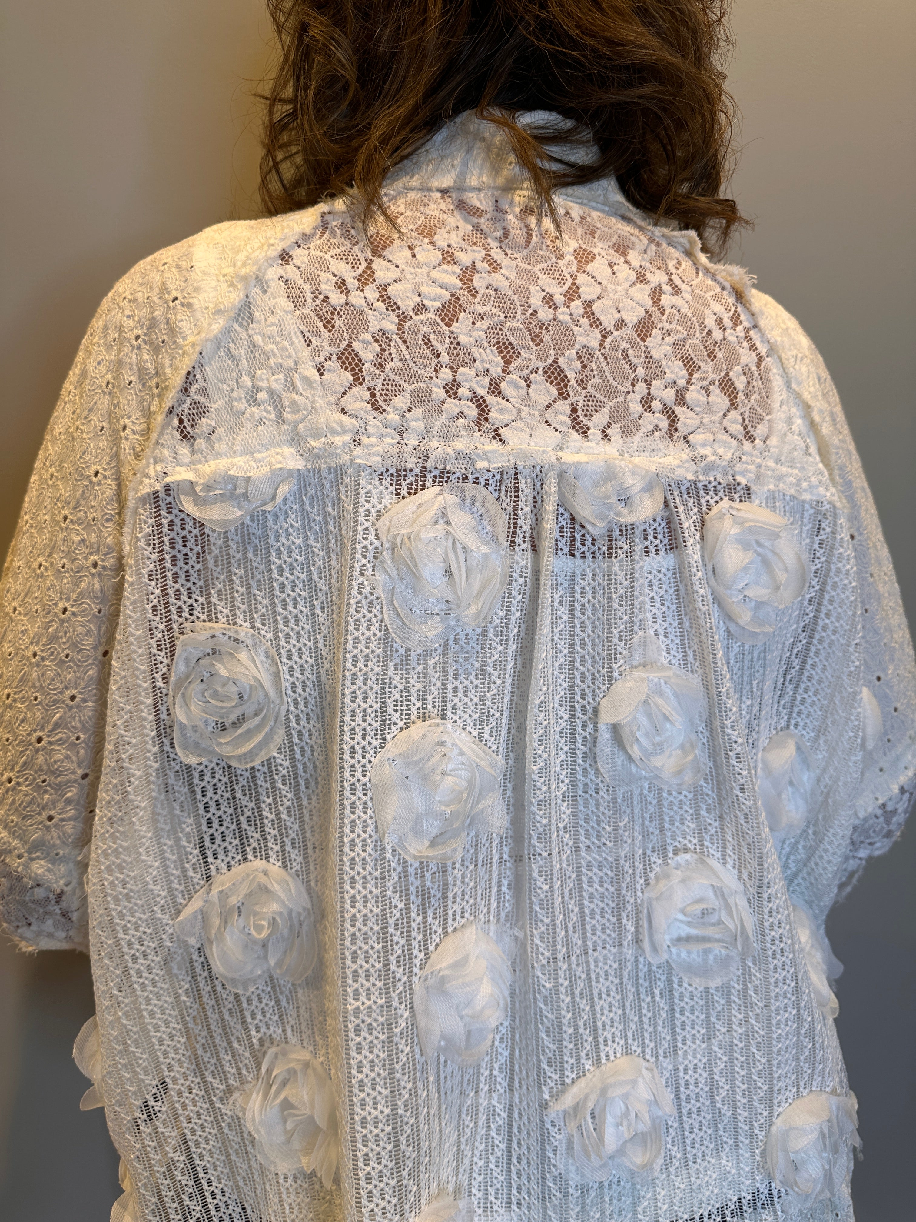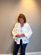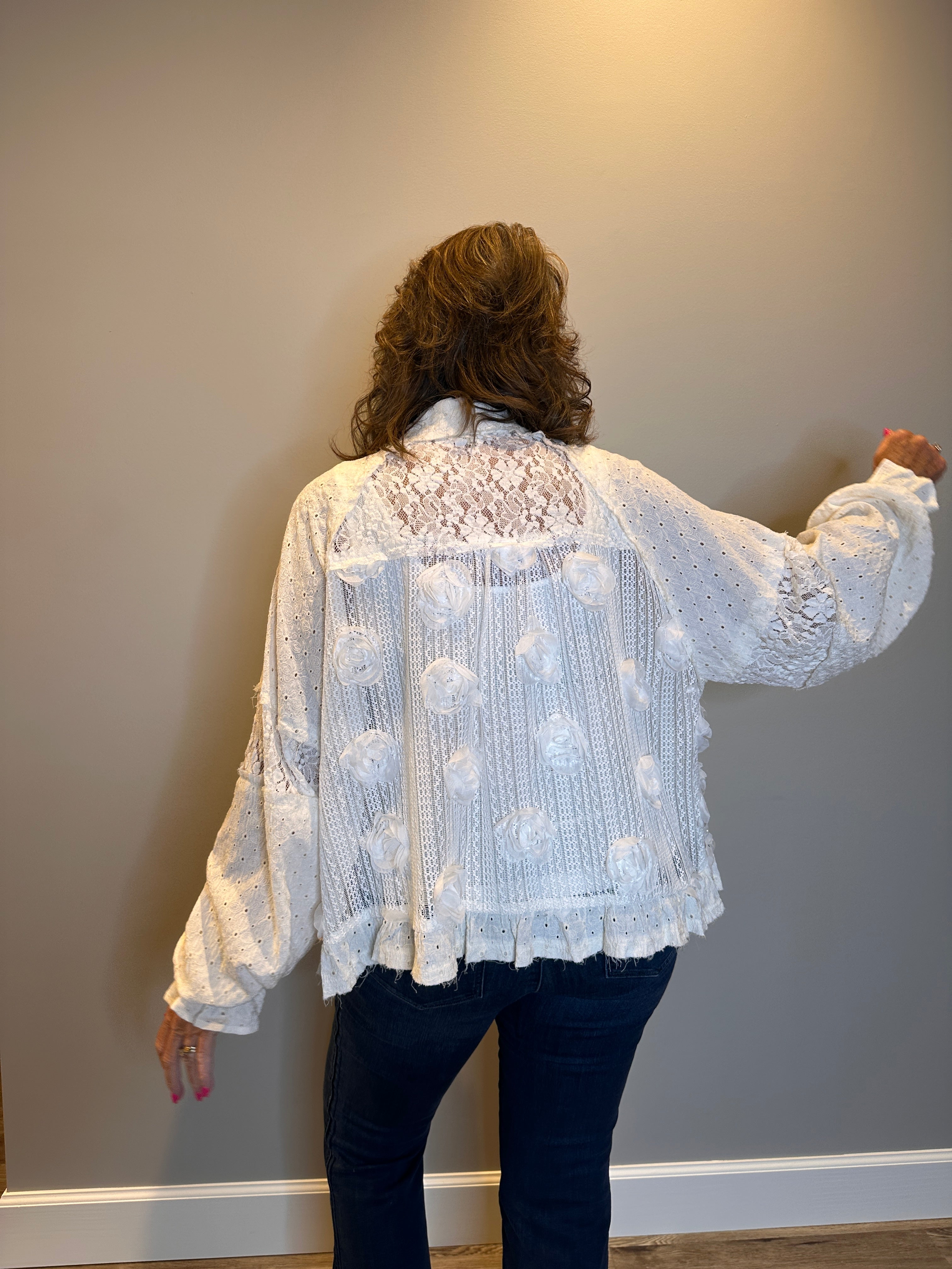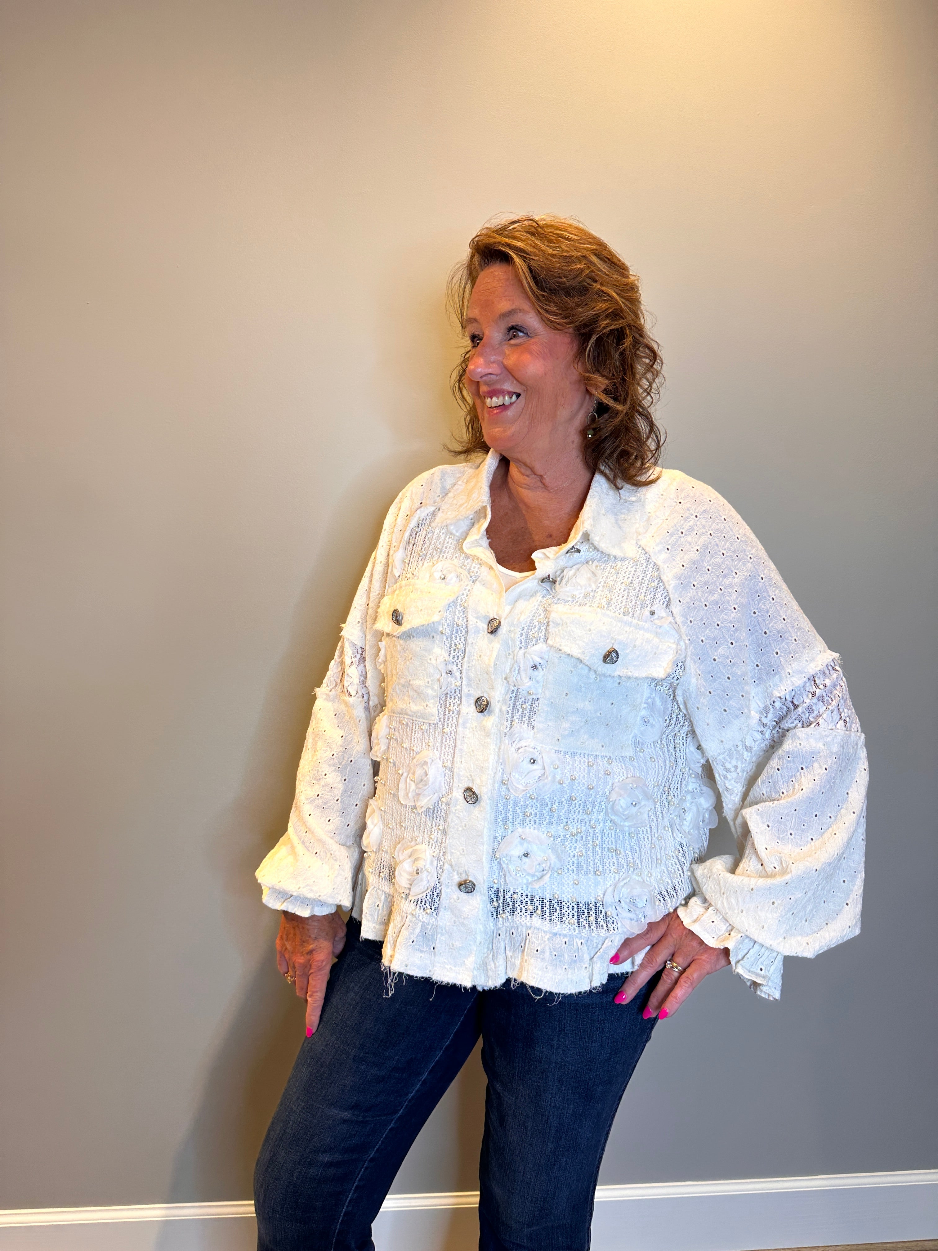 This ivory long sleeve jacket blends intricate craftsmanship with vintage charm. Elastic sleeves create a soft ruffle effect and raw edge detailing at the collar and hem adds subtle texture. Dolman seams and patched eyelet fabric are layered with lace, pearls and meshed rosettes with stones set inside the front rosettes for a sparkling touch. Artisan metal buttons and functional breast pockets complete the design and rosette details continue onto the back for a fully dimensional look.