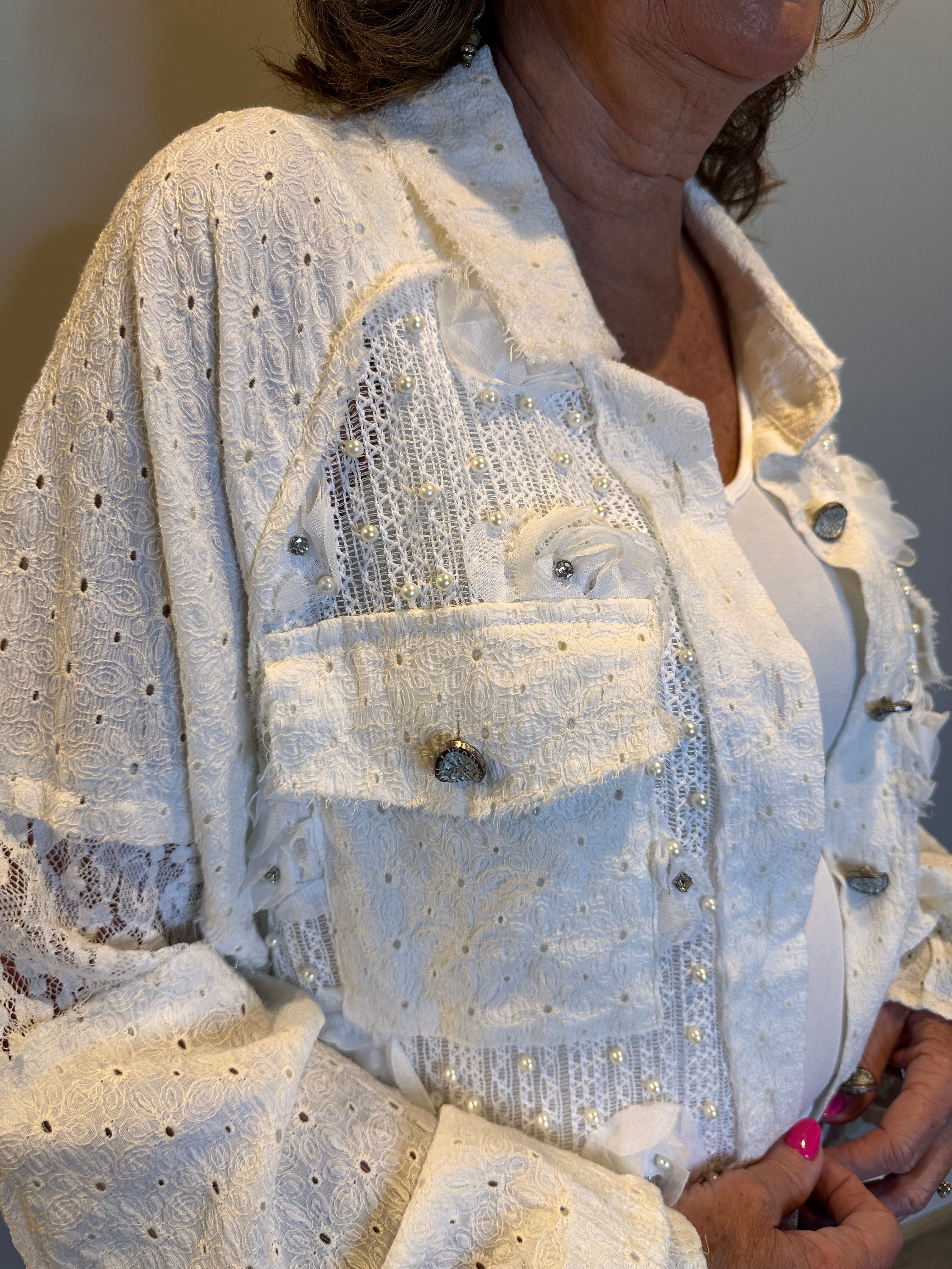 - Patched eyelet fabric with lace, pearls and meshed rosettes