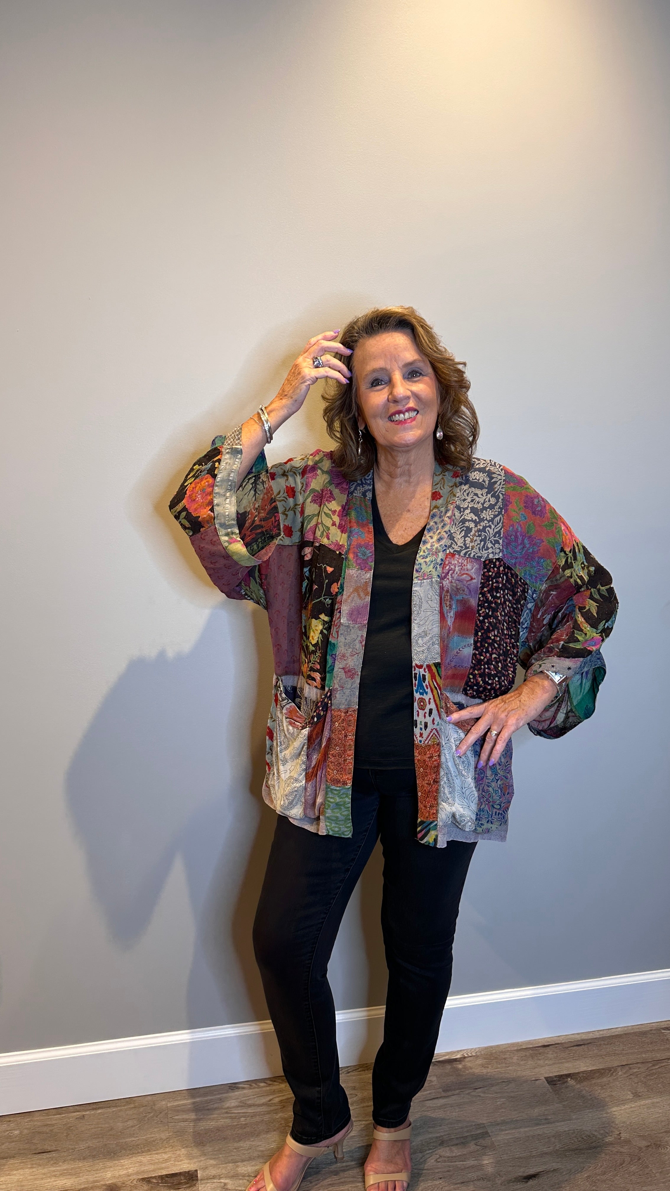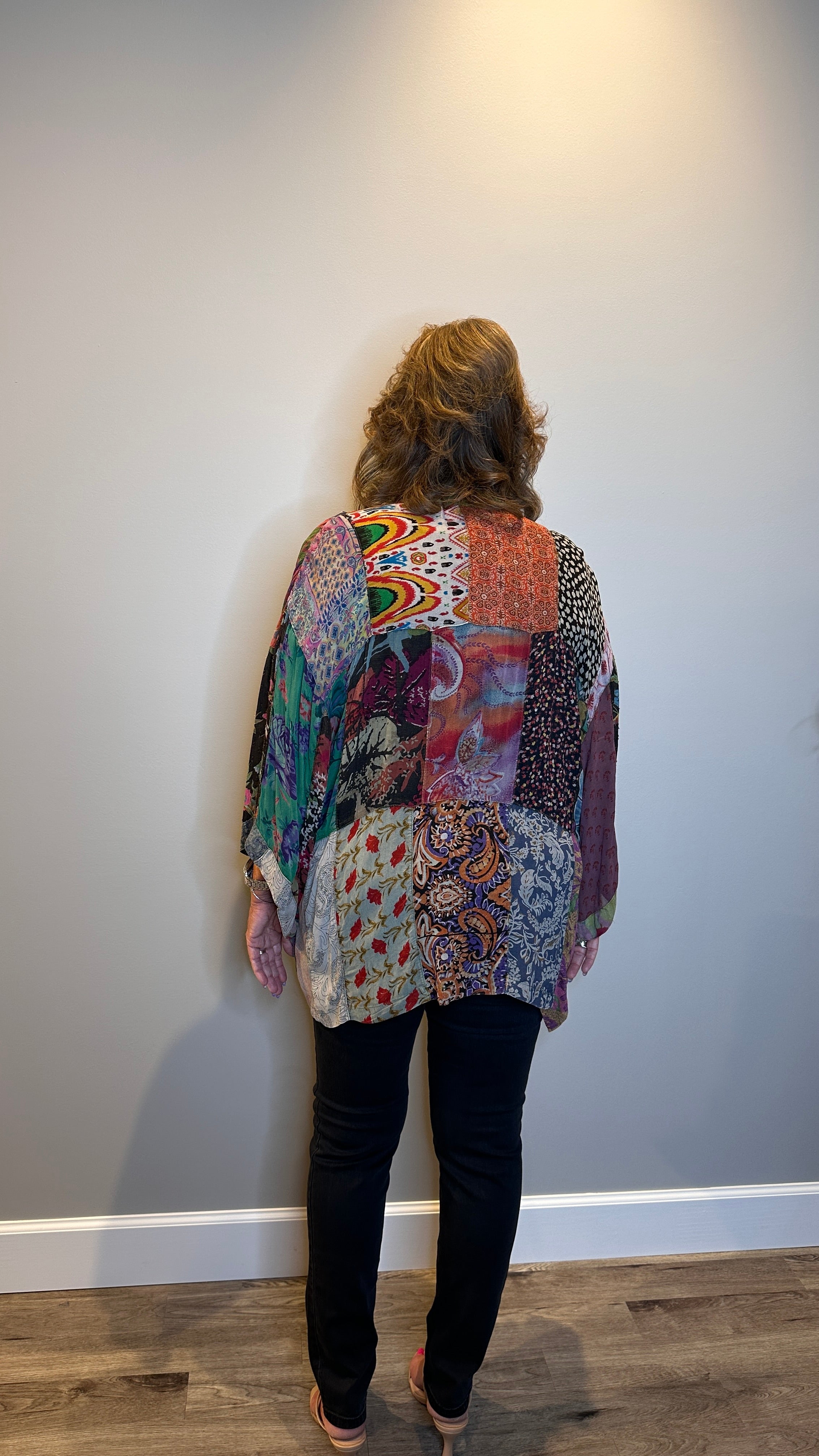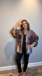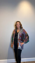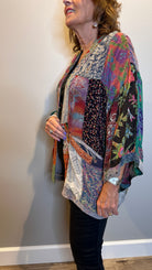 A modern take on tradition, this kimono style jacket is crafted from a mix and match patchwork that feels both eclectic and elevated. Designed with 3/4 sleeves and roomy patch pockets, it's the perfect statement layer to throw on and go, effortless, artistic and versatile.