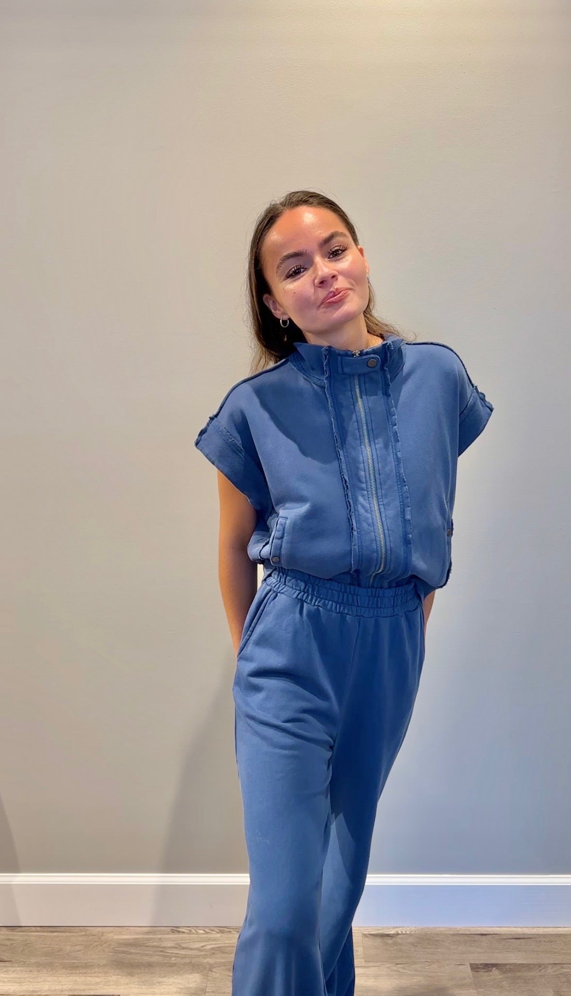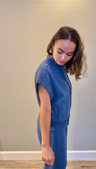 A modern, sporty layering piece, this zipper vest features raw-edge seams, matter silver hardware and a snap closure at the high neckline. Cap sleeves and rib knit detailing at the collar, hem and side seams give a polished finish while front pockets with snap closures add functional style.