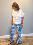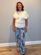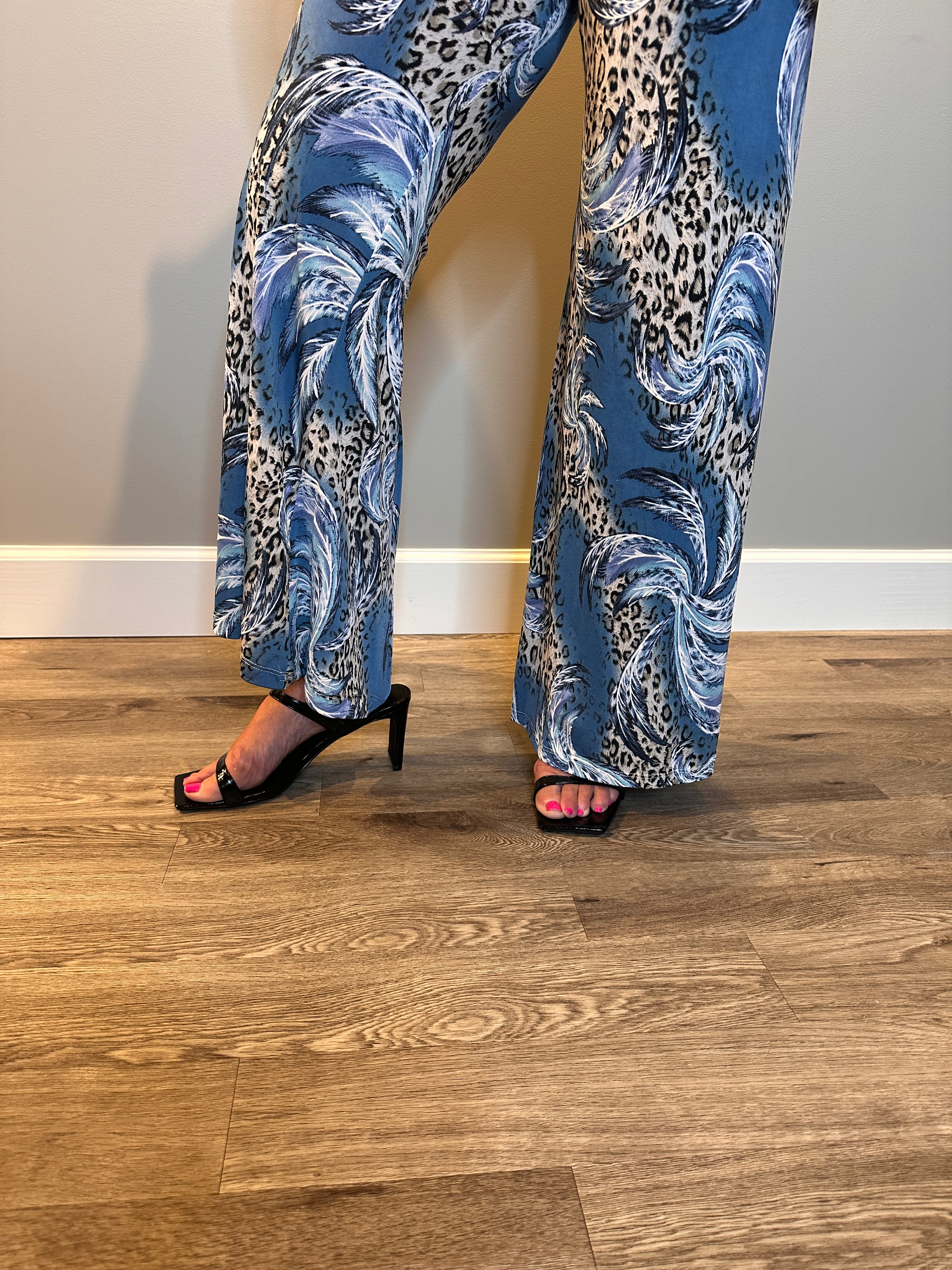 A fresh take on animal print, these palazzo pants feature an abstract blue design with puff print texture for added depth. The wide waistband flatters the figure while the flowing leg creates effortless movement. Bold yet versatile, they bring a playful pop to both casual and dressy looks.