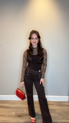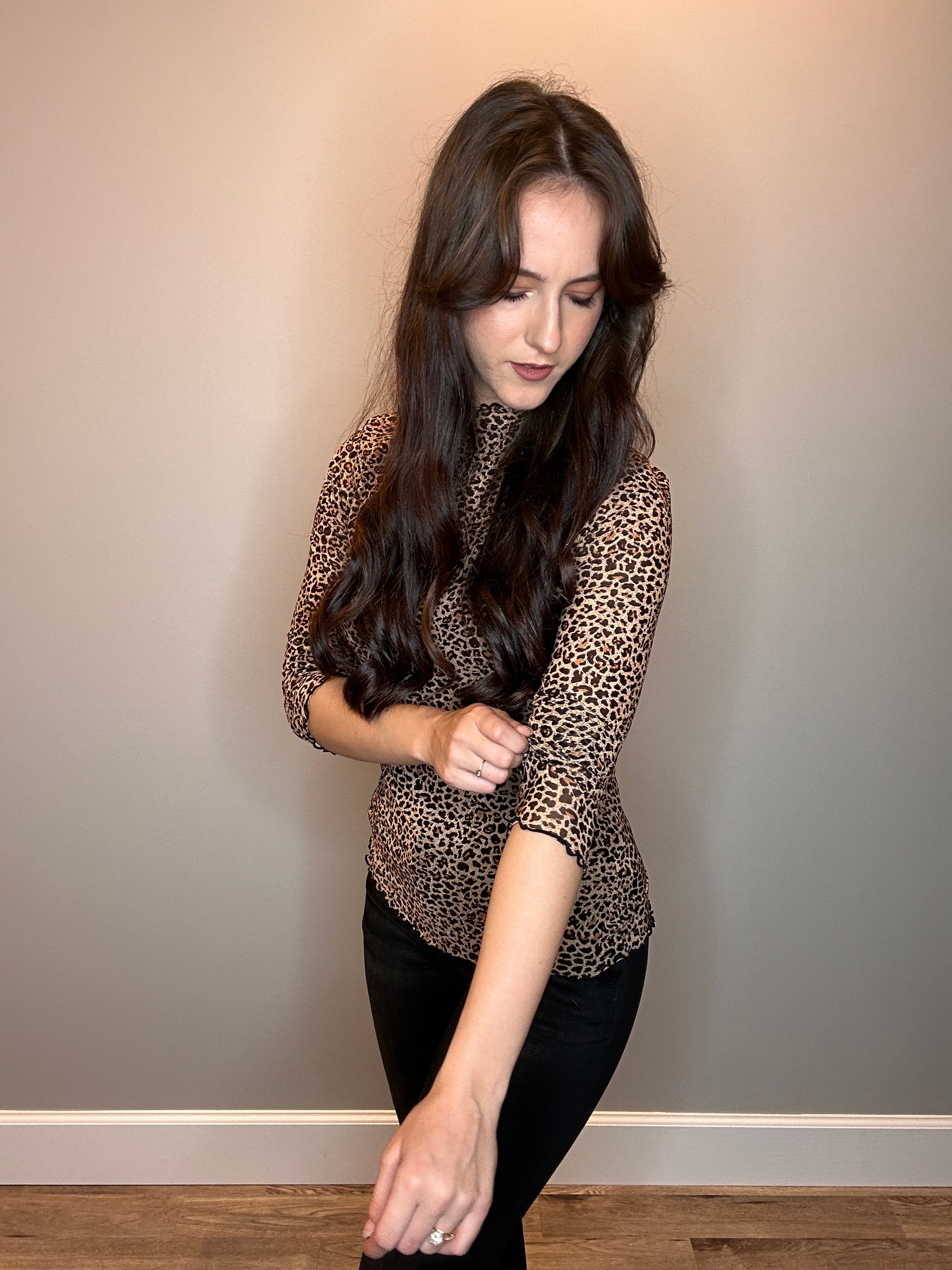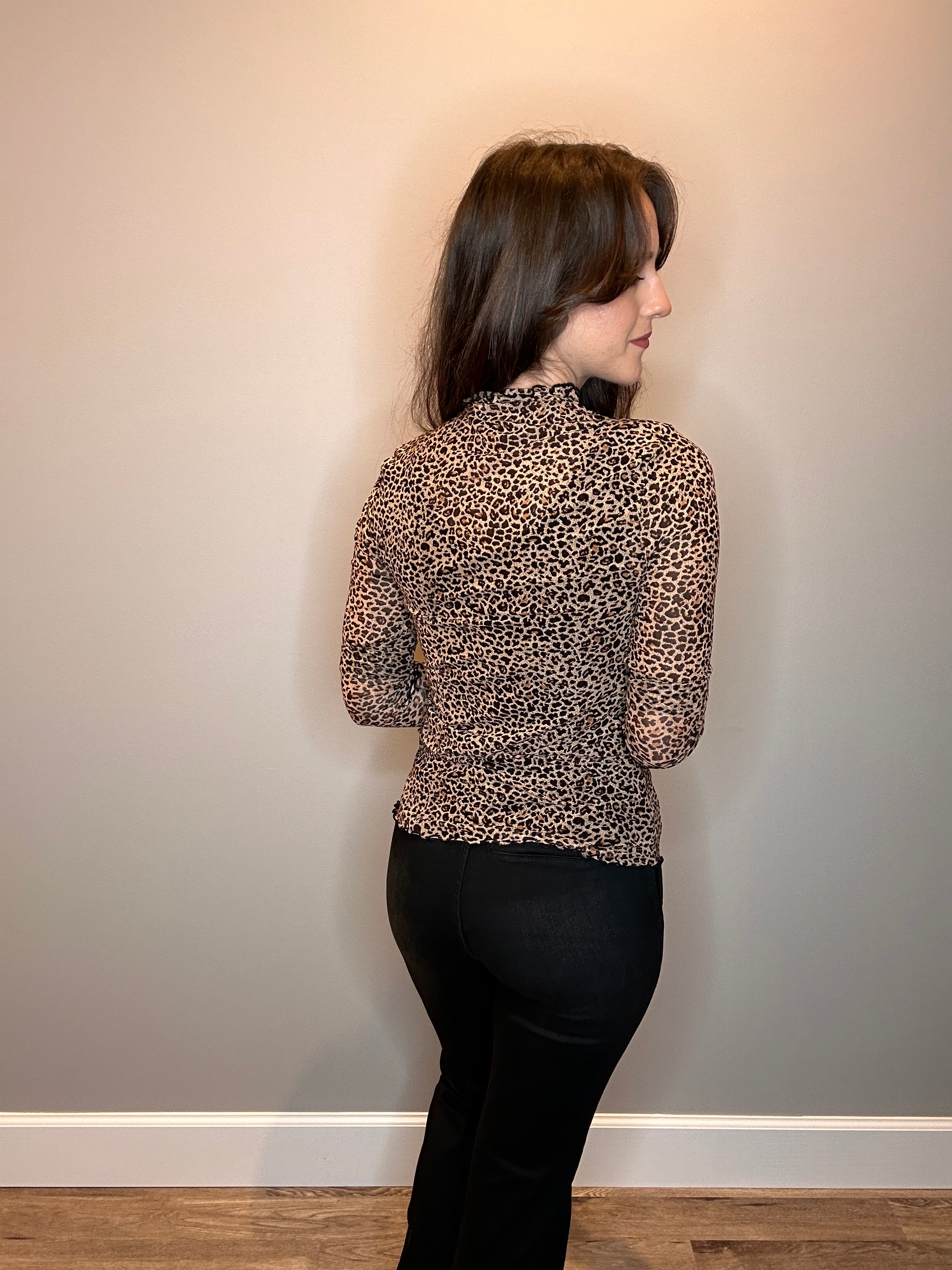 Animal Mesh Mock Neck Top with Lettuce Edge Trim