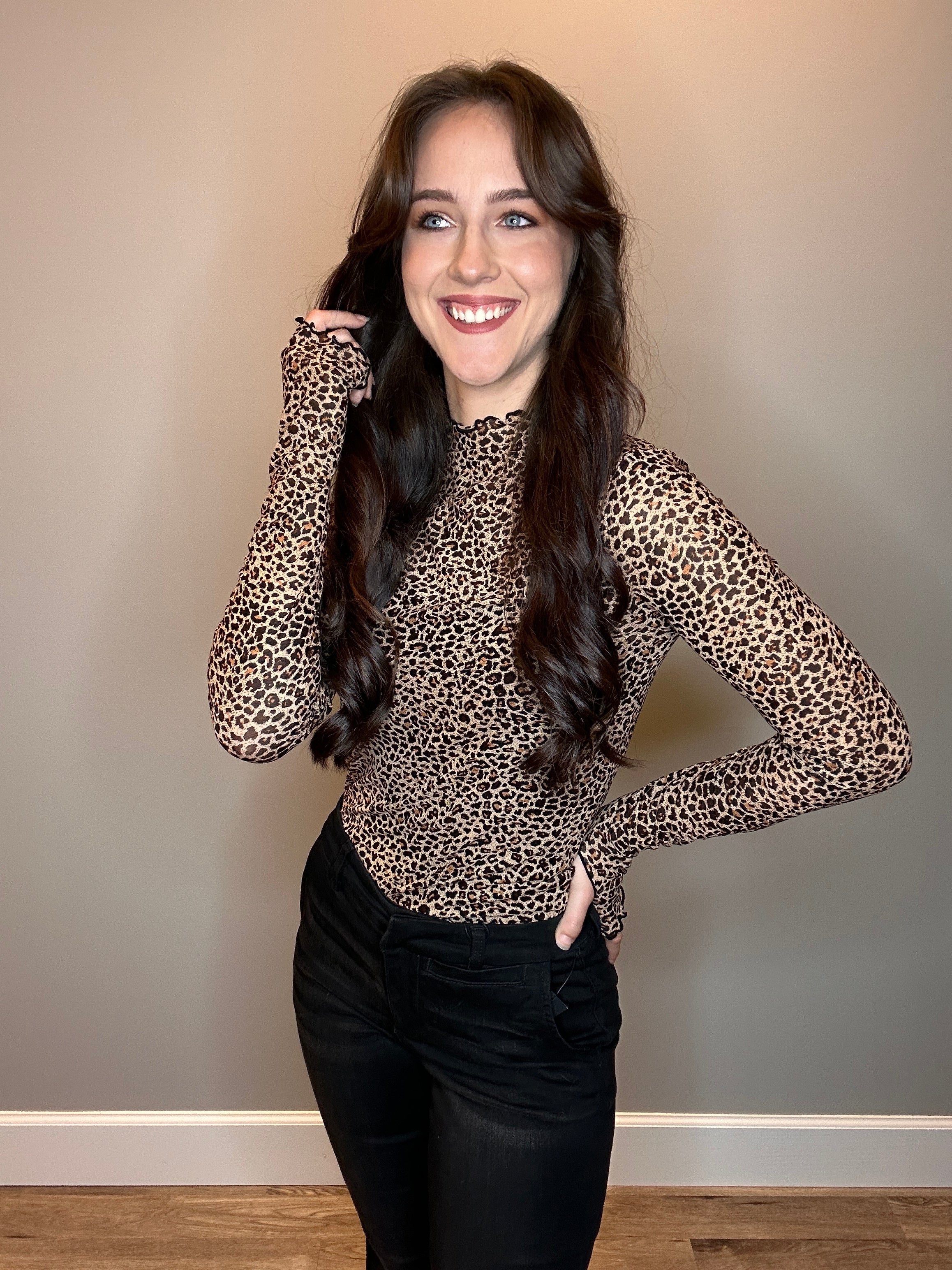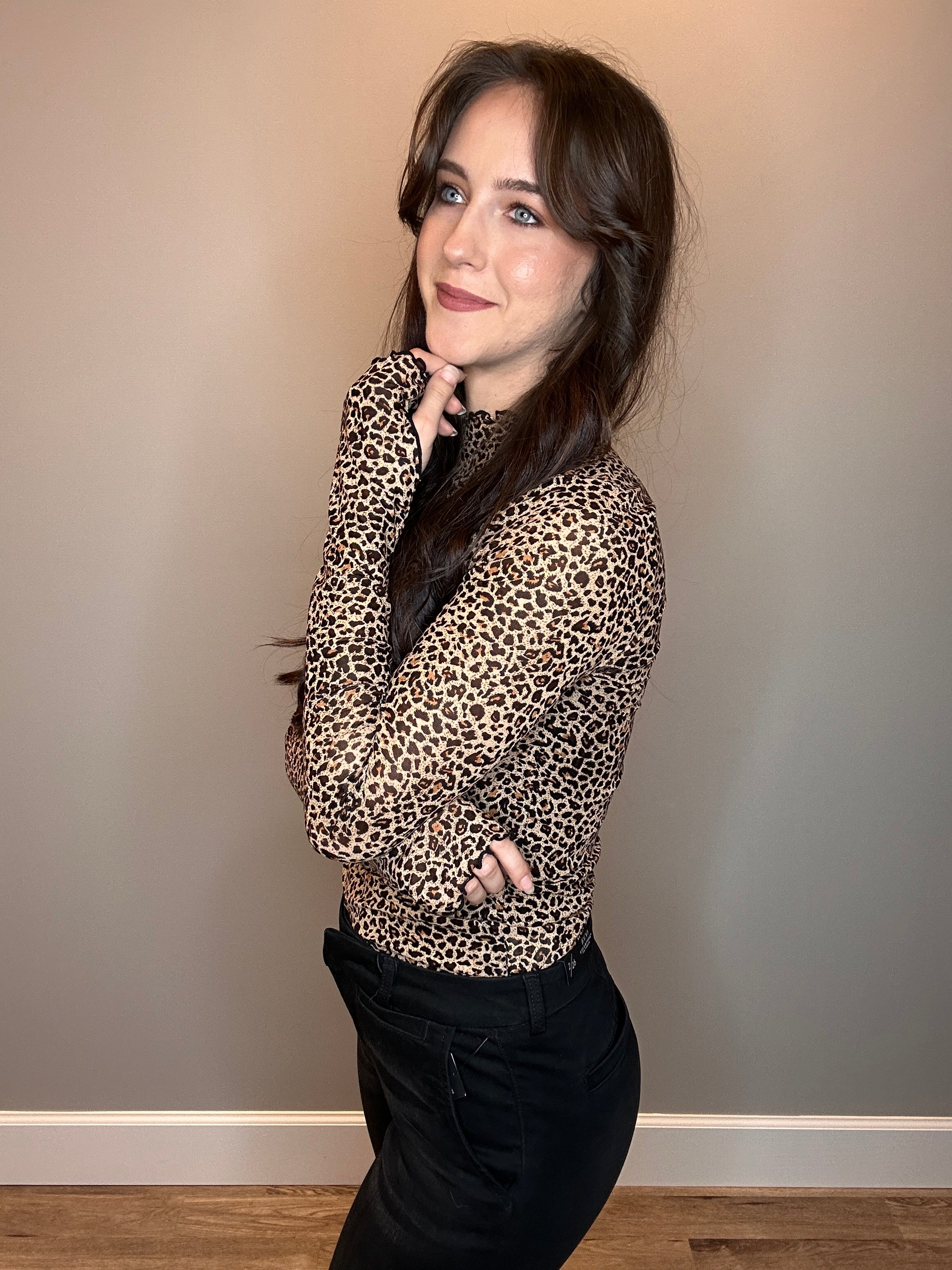 Sheer animal print mesh top with a sleek mock neckline finished in delicate lettuce edging and black tipping. Long sleeves feature thumbhole detail for a modern edge. Hem is trimmed with matching lettuce edging for a cool, polished finish.