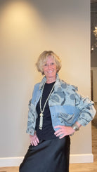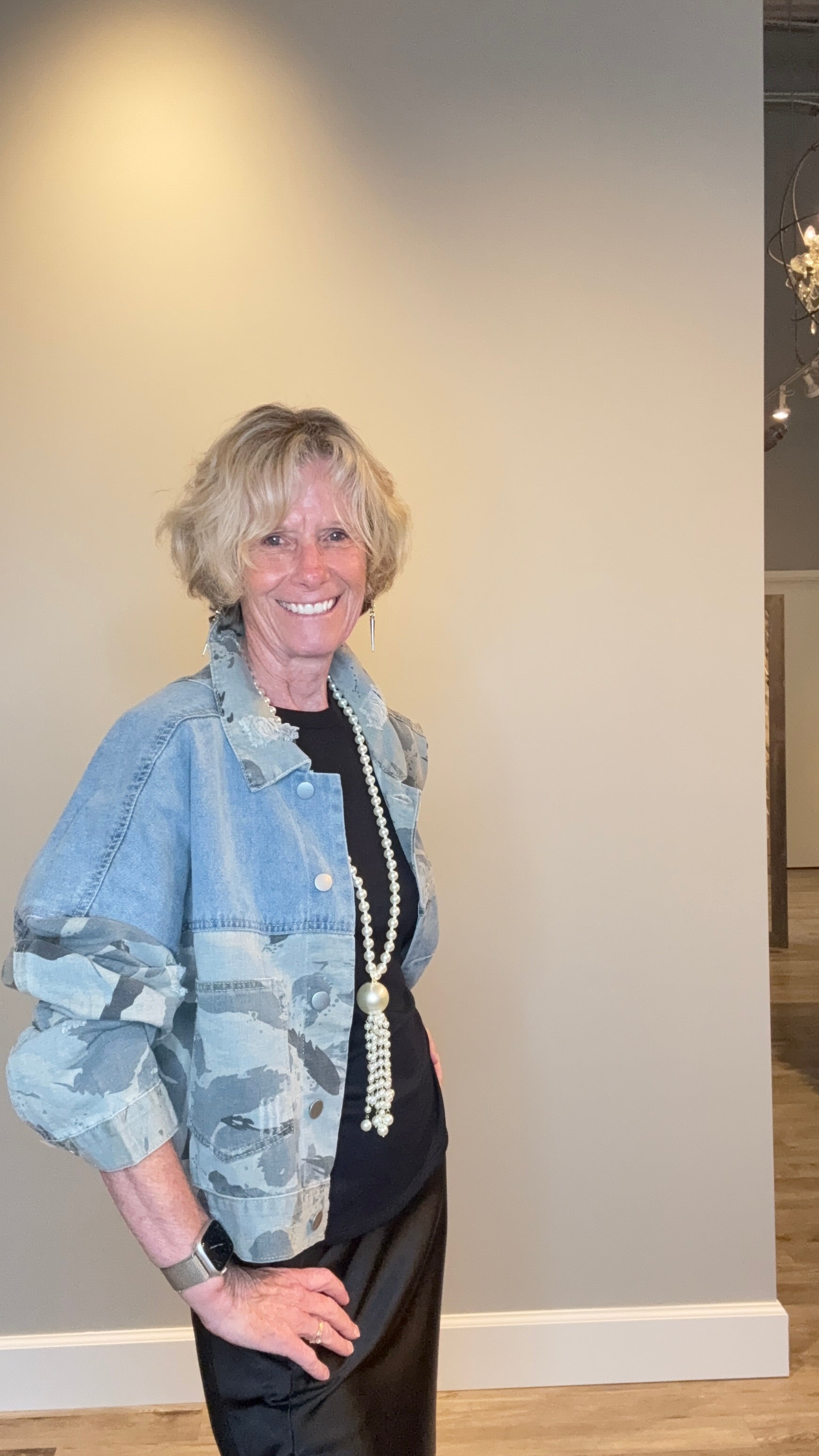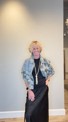 Turn heads in this deconstructed denim jacket with an edgy mix of leopard and camo-inspired prints. Designed in a relaxed oversized fit, it combines lightweight comfort with street style attitude. Uneven seaming, splash effect camouflage details and drop front pockets give it a one-of-a-kind factor. Matte silver buttons and adjustable waistband tabs finish it off with utility inspired touches.