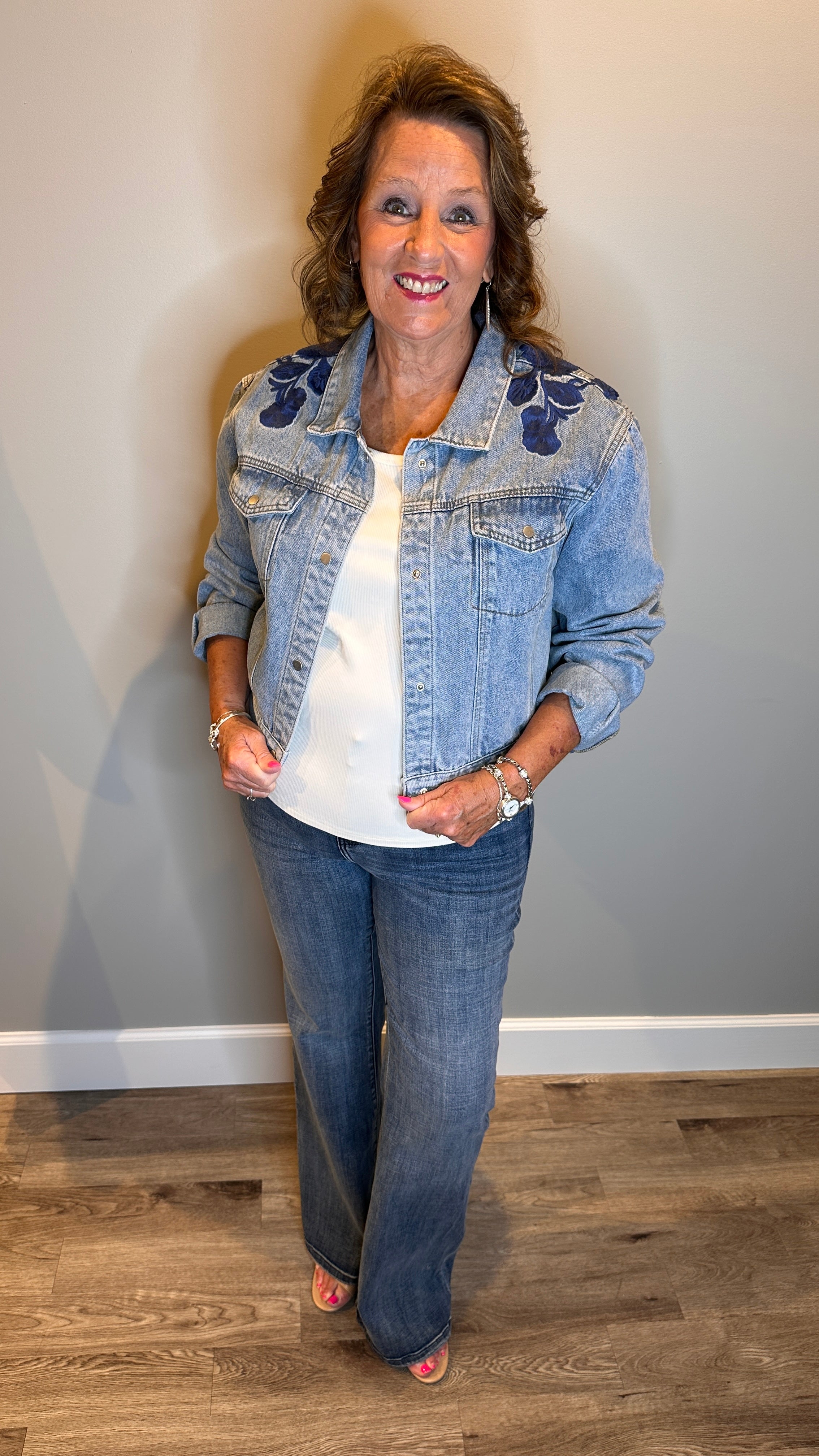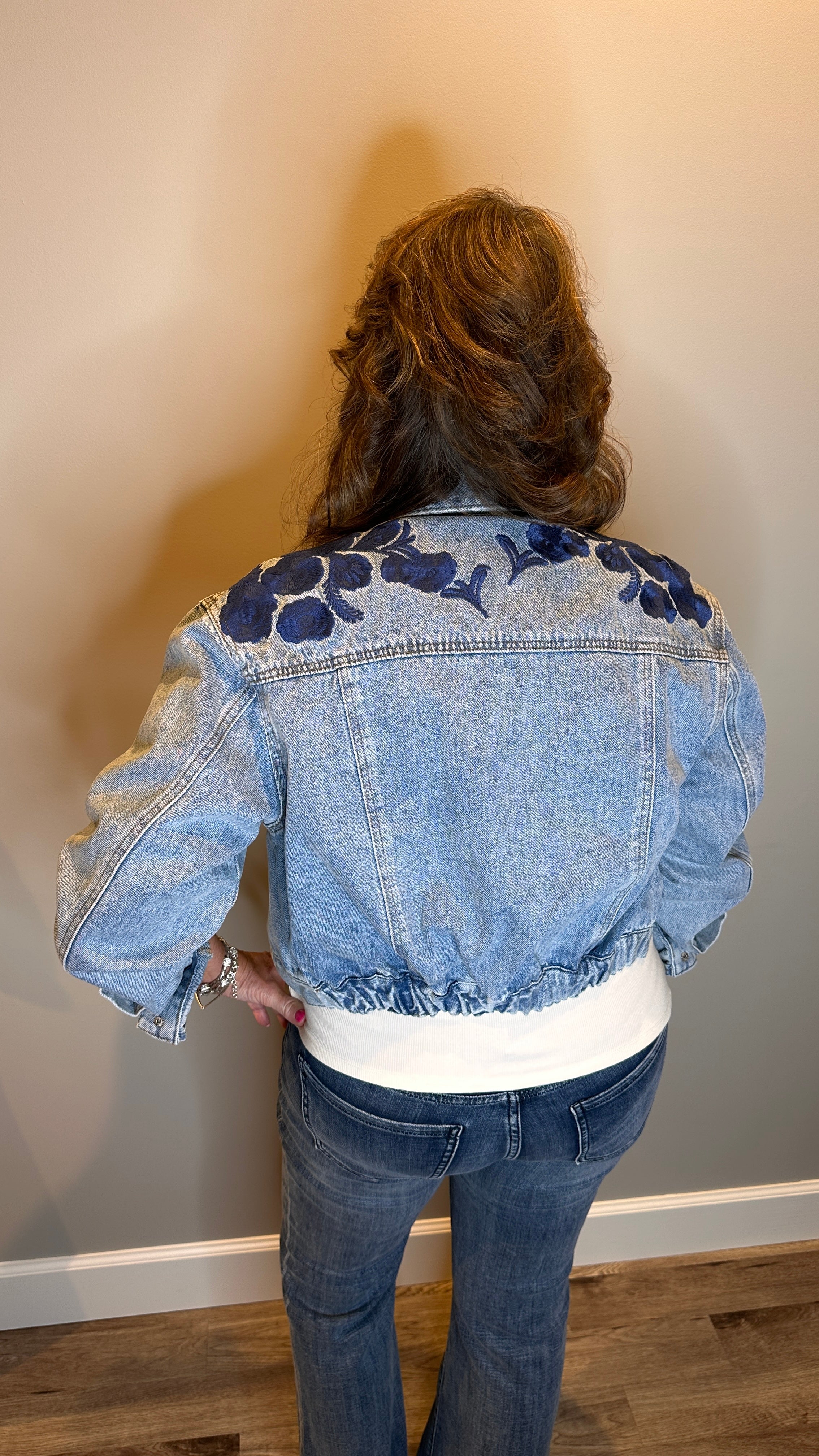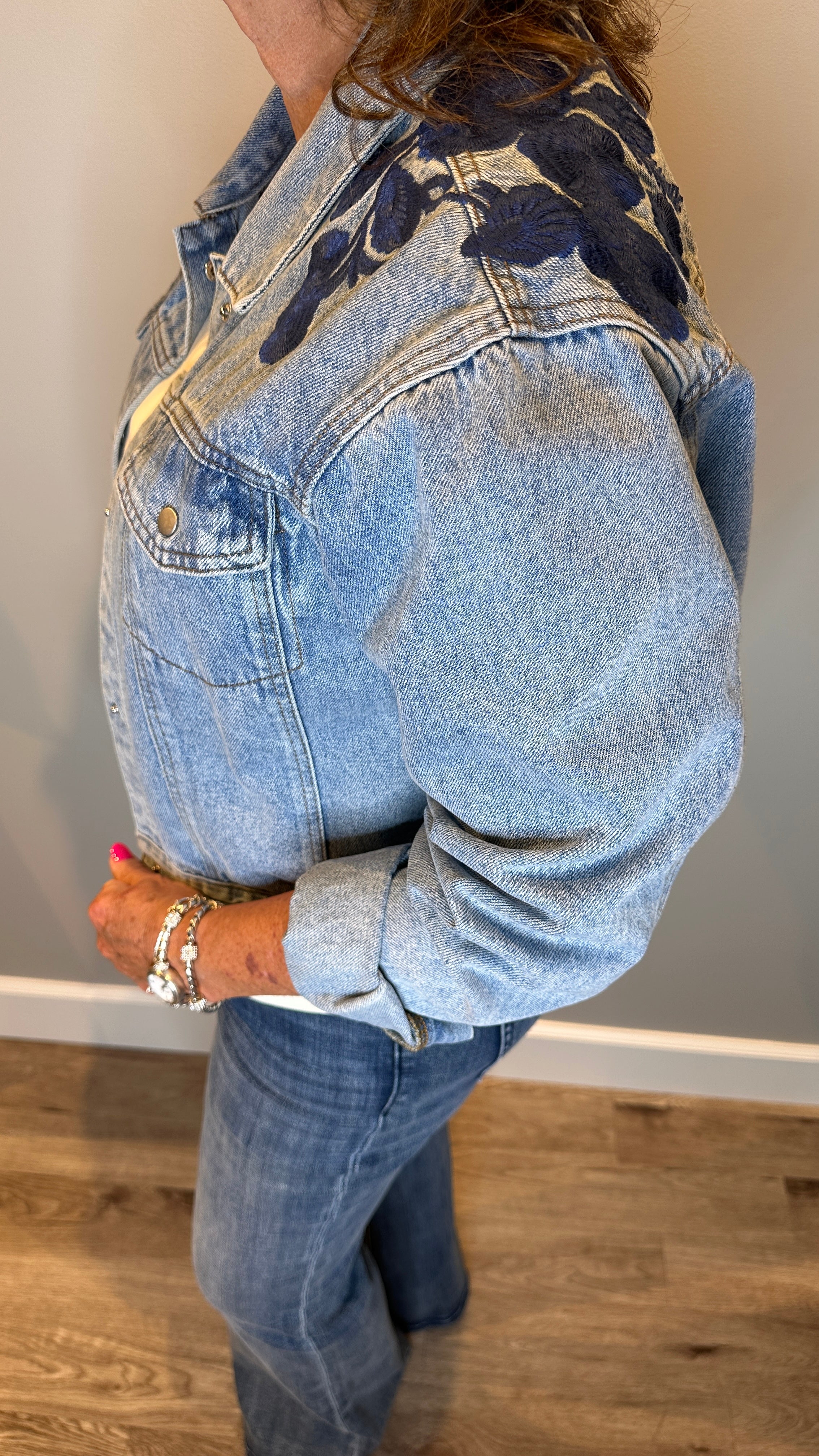 Embroidered Blue Denim Jacket with Snaps & Elastic Back Waist