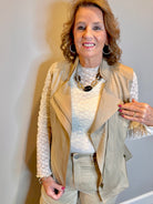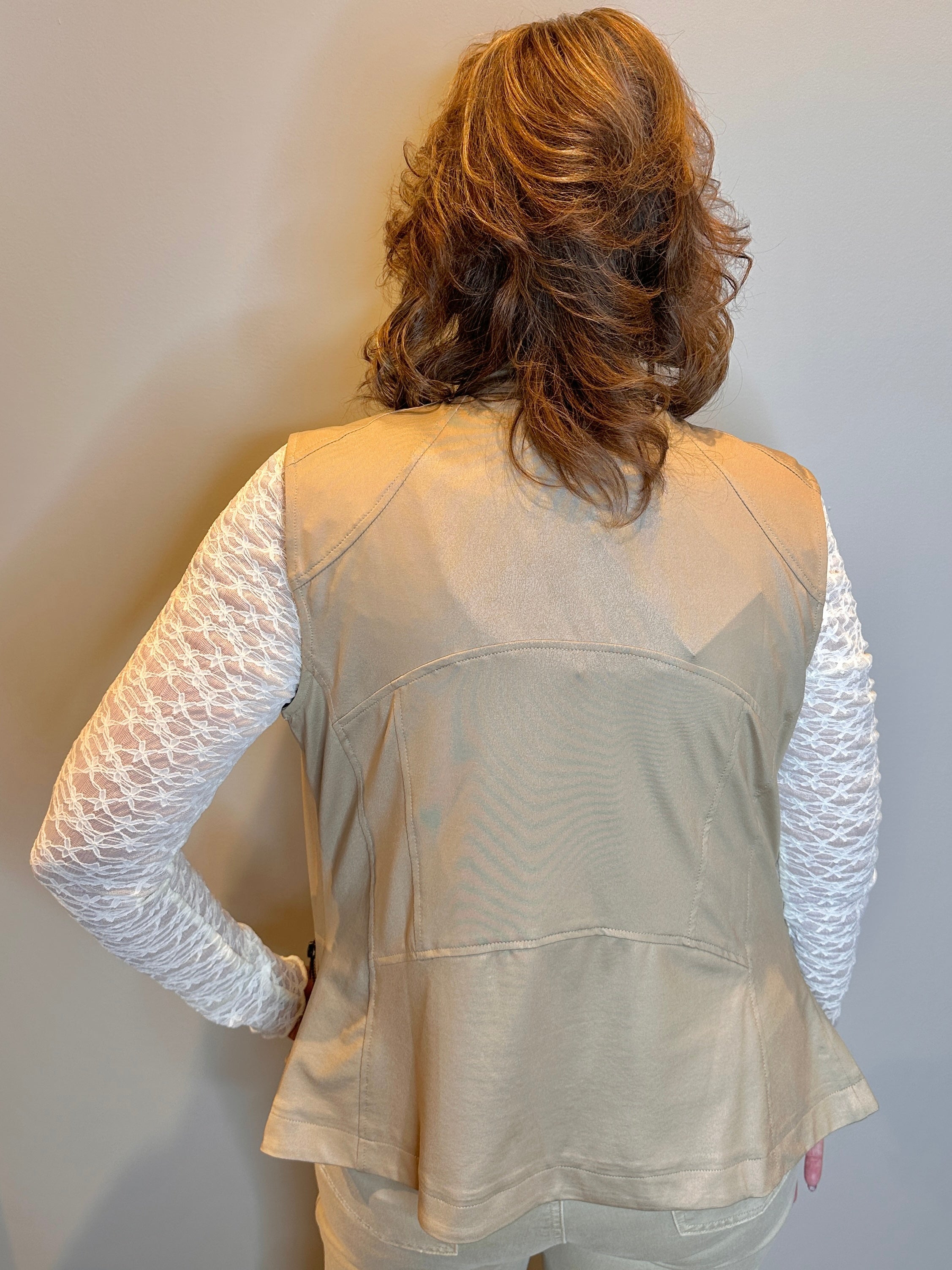 Lightweight faux leather vest with zipper closure and a playful zipper detail letting you show off the top underneath for an edgy, fashion-forward twist. Designed with a sleek mandarin collar and flattering princess seaming.