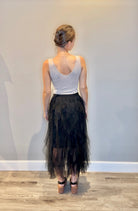 Delicate and dreamy, this midi skirt features layers of soft ruffled tulle for movement and volume. The elastic waistband ensures a comfortable flattering fit and a half lining provides coverage while maintaining the skirt's airy, ethereal feel.