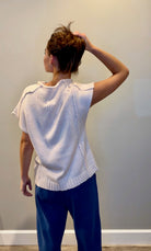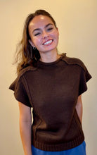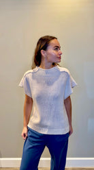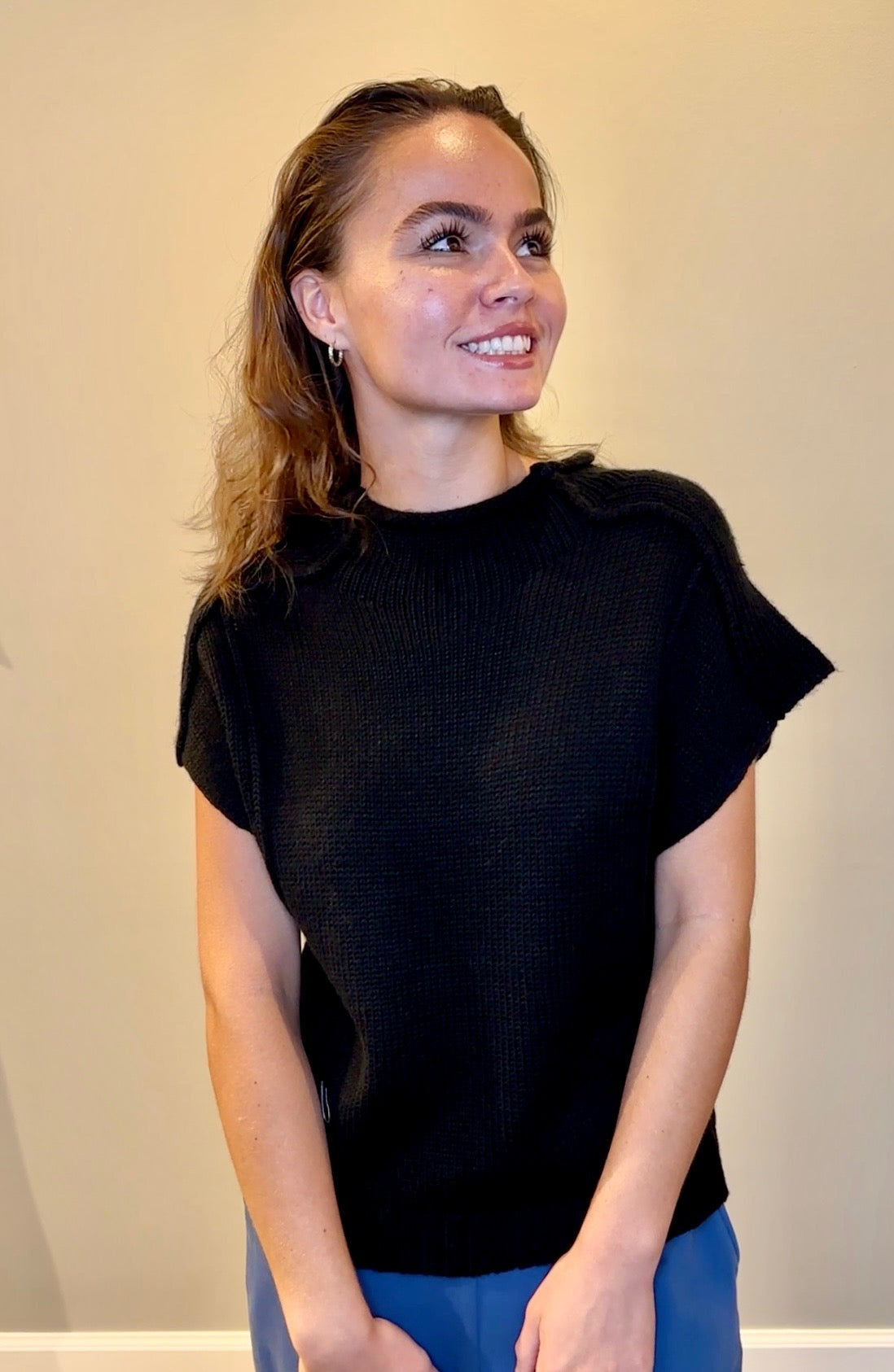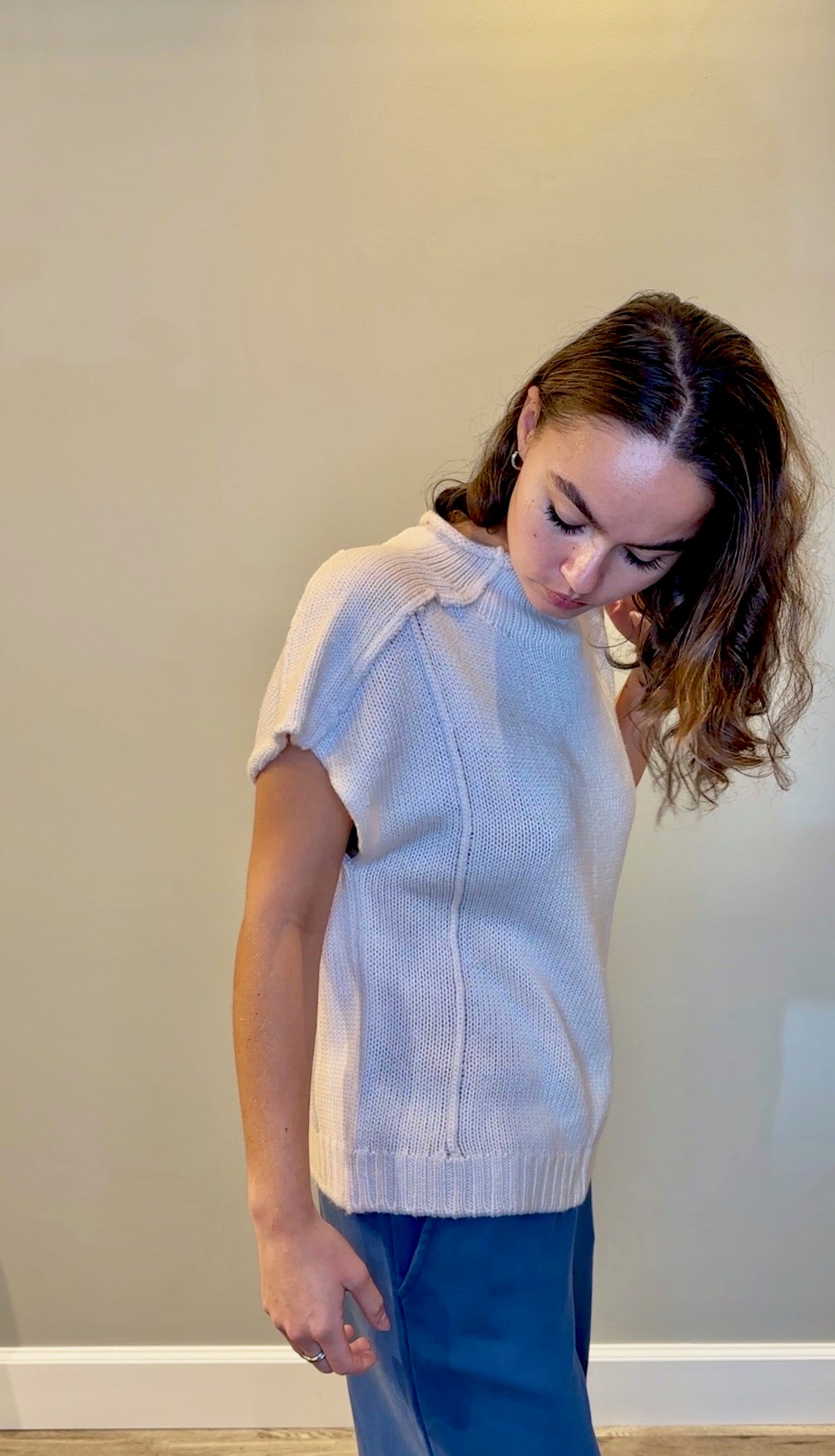 A modern take on a classic knit, this crew neck cap sleeve sweater is designed with a subtle rolled neckline and cool, thick-gauge seaming at the shoulders. Front and back seam details add structure and give this easy silhouette a refined edge.