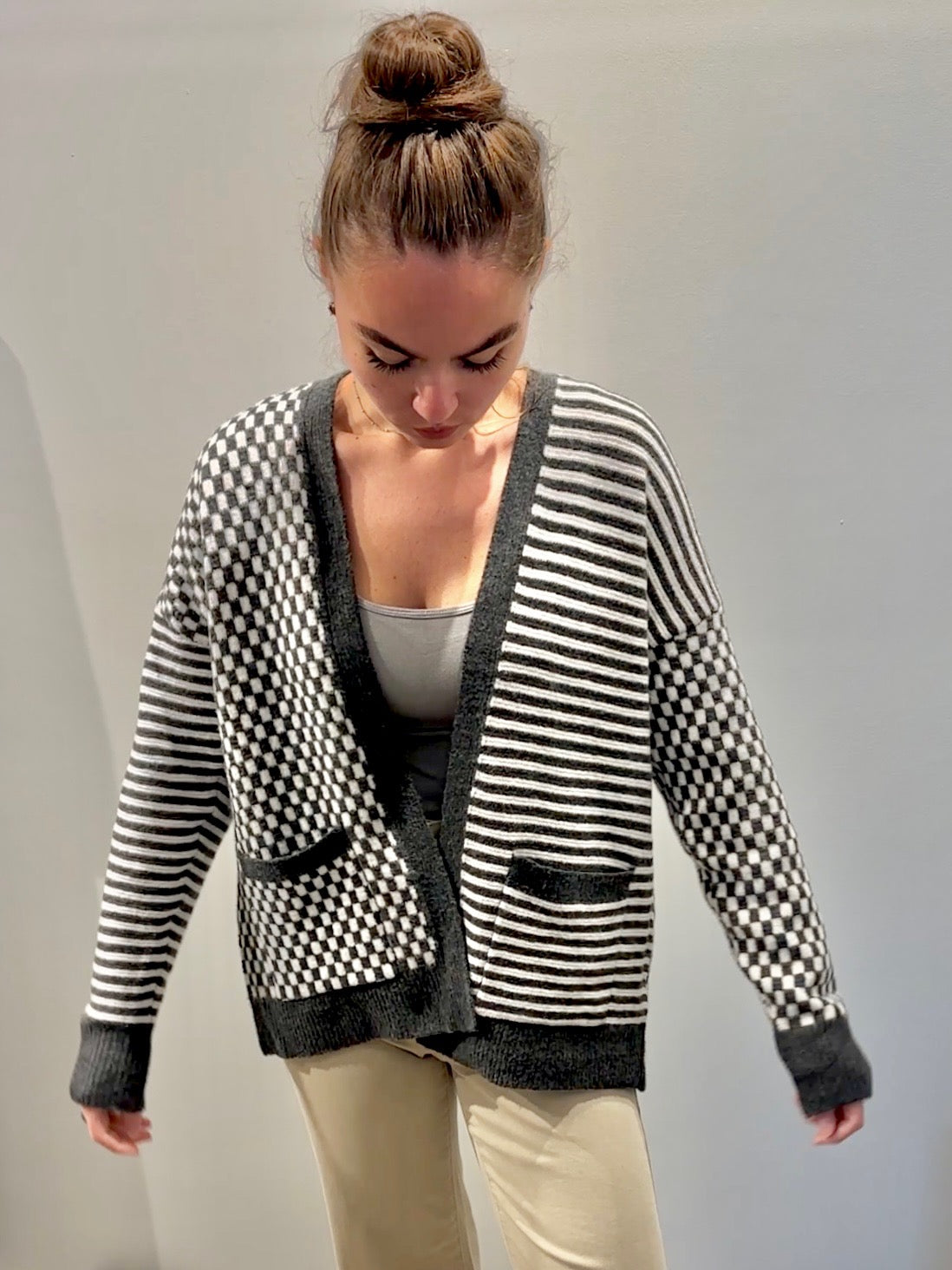Soft Knit Checkerboard & Stripe Mix Media Cardigan