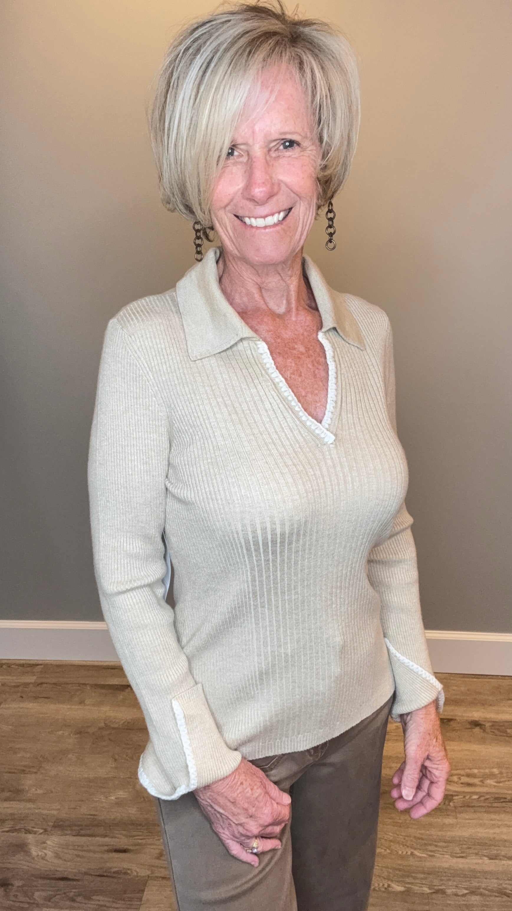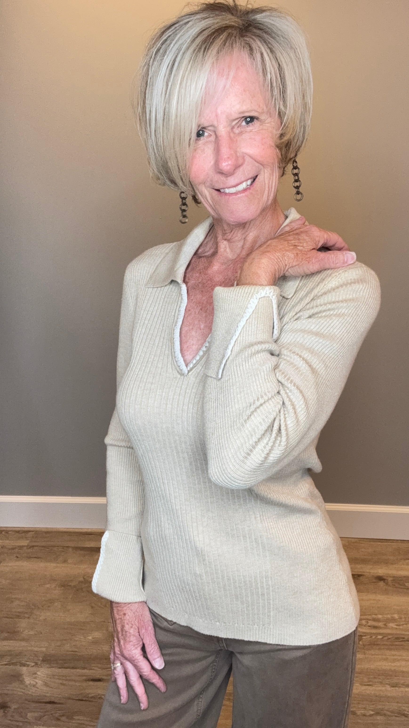 Designed with a flattering V-neckline and long sleeves, this style is elevated with contrast stitching at the collar and and sleeve hem. Crafted from spun rayon fabric for a buttery soft, comfortable hand feel that drapes beautifully.