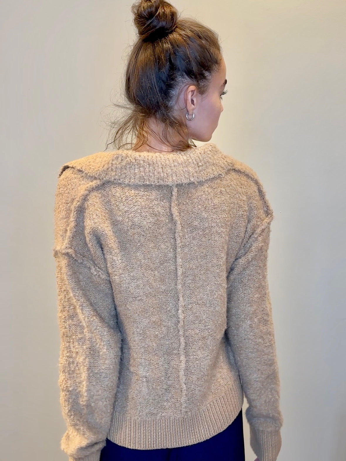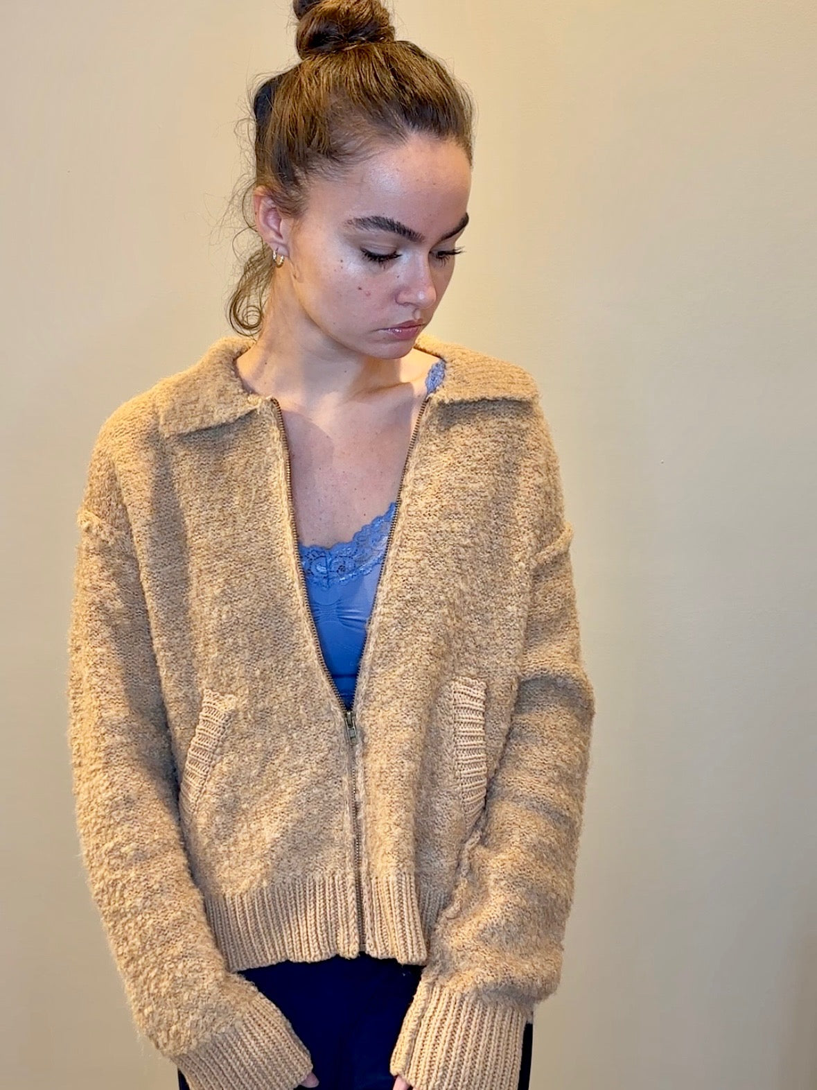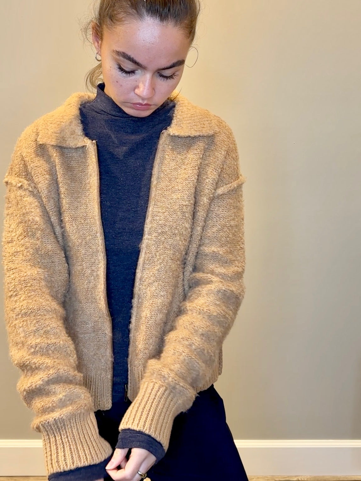 This Zip-up sweater jacket combines cozy texture with thoughtful detailing. Crafted in a soft popcorn like knit, it's designed with sweater knit stitching at the pockets, hem and cuffs for added dimension. Exposed seam stitching enhances the look giving the piece depth and a contemporary edge. Perfect for layering when you want warmth and style.