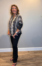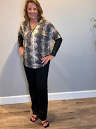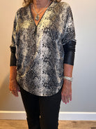 This standout top mixes bold animal print with edgy faux leather sleeves for a statement look that's both chic and versatile. The dolman cut creates an easy, relaxed fit while the oversized zipper pull adds a modern touch to the neckline.