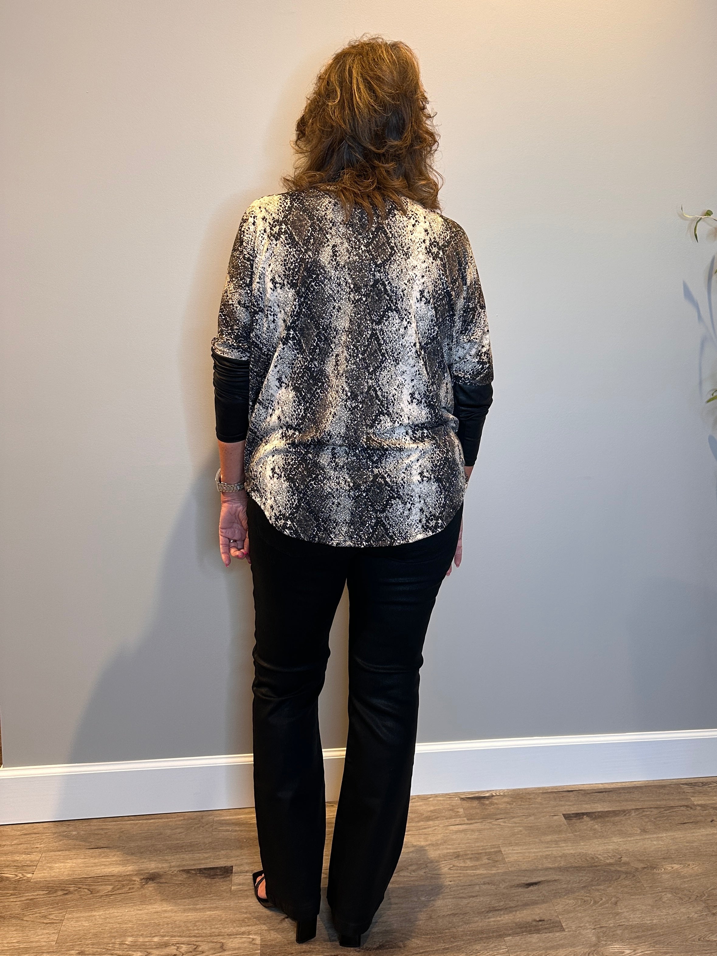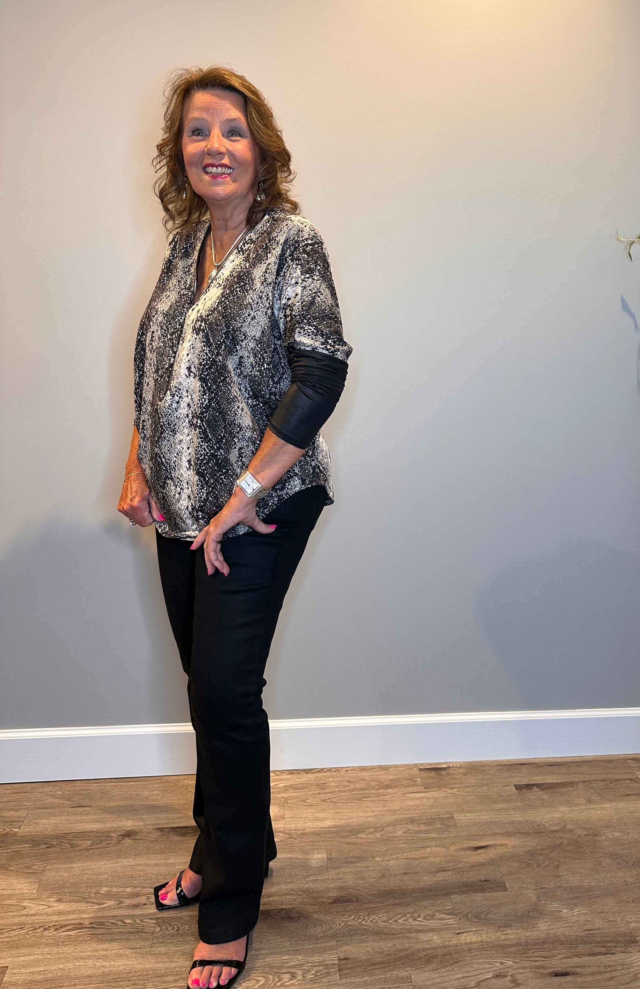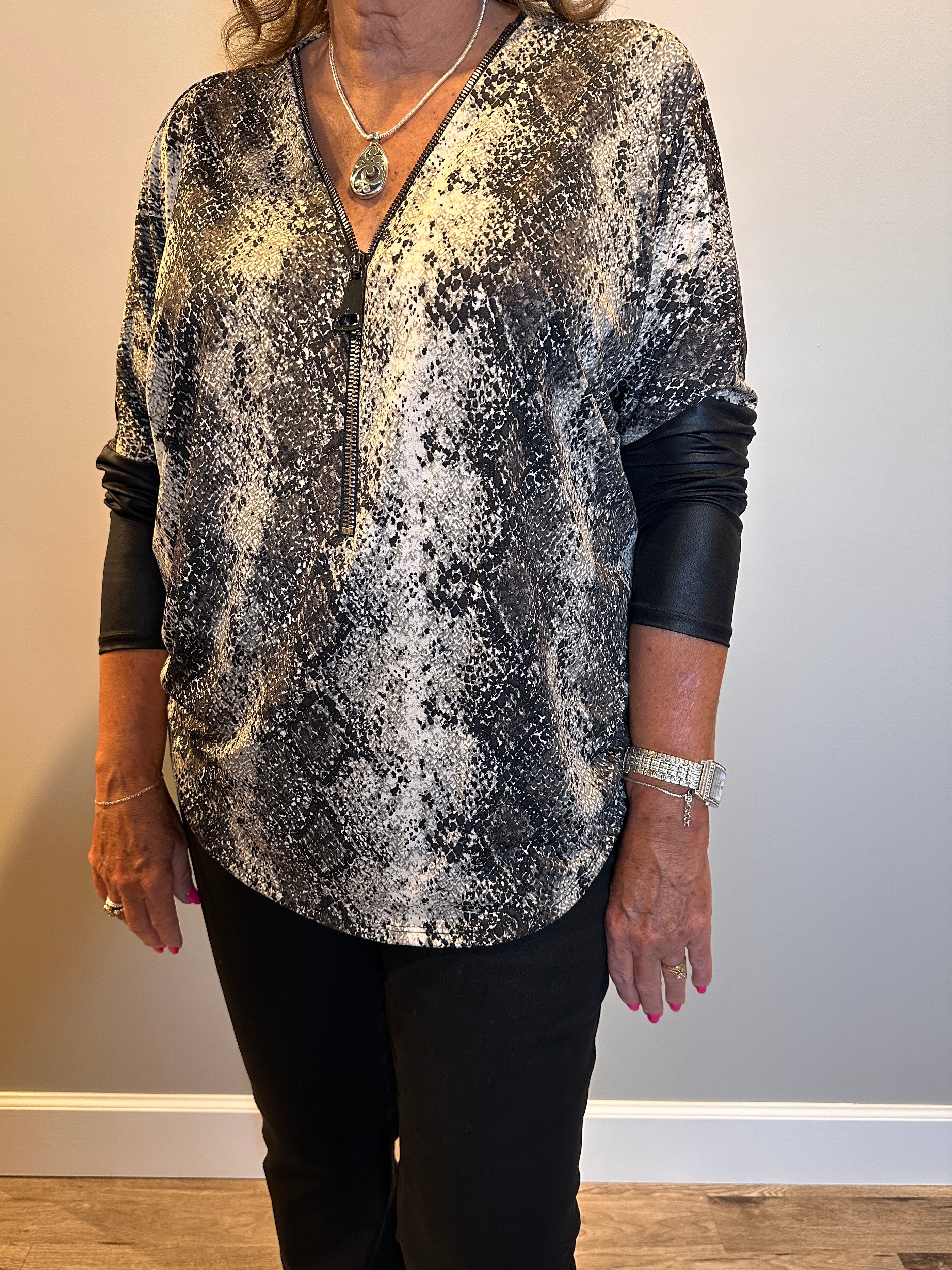 Dolman Sleeve Zipper Top with Animal Print and Faux Leather Sleeve