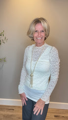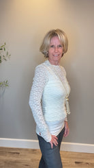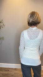 Romantic lace long sleeve top with a mock neck and delicate flower pattern. Soft and lightweight wit pretty lettuce edging for a feminine finish.