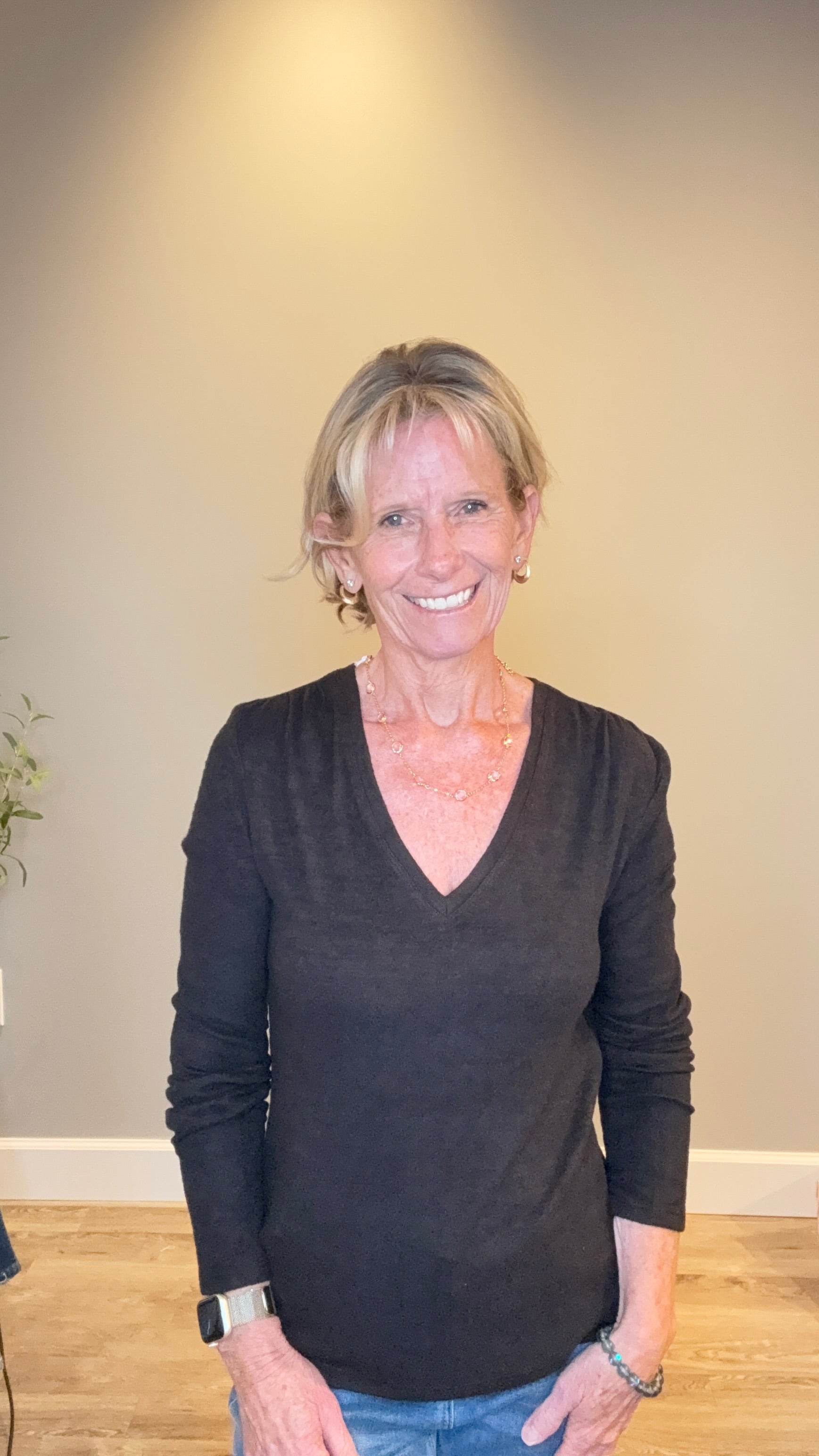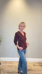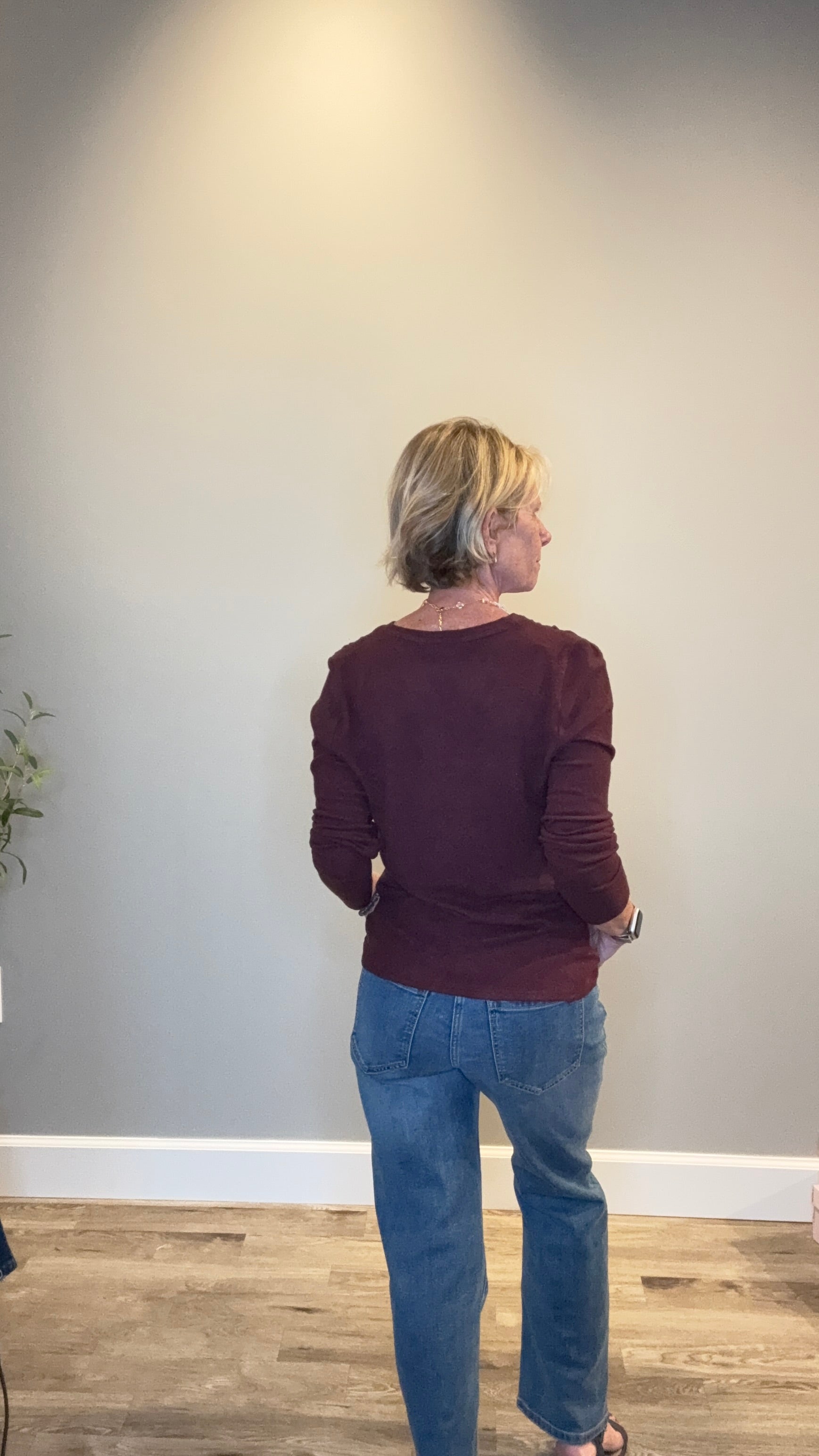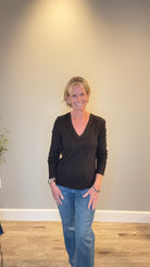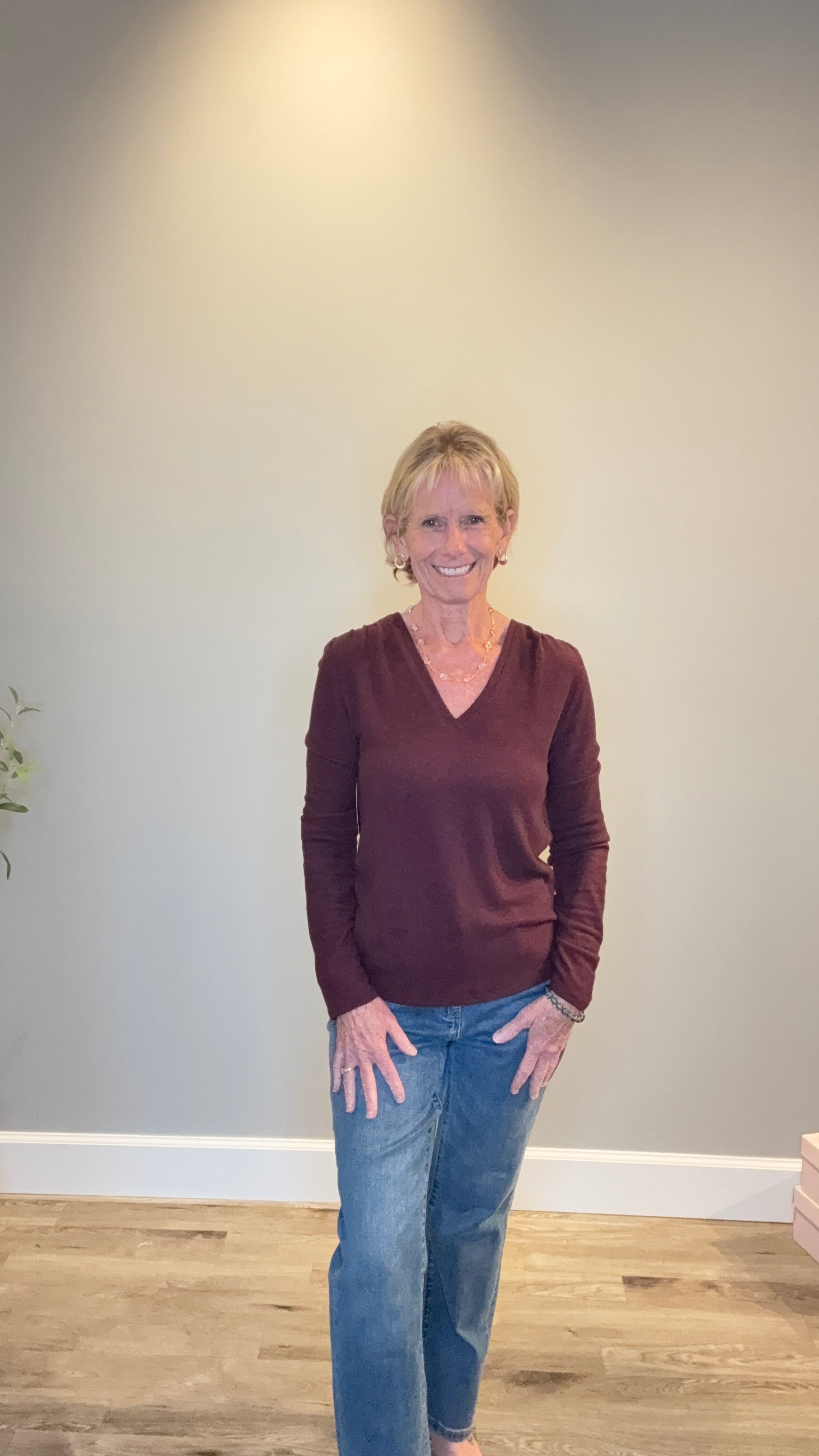 Long sleeve V neck top in soft melange fabric. Designed with subtle gathers at the shoulder for a feminine touch. Effortlessly versatile that is easy to dress up with tailored pieces or wear casually with denim.