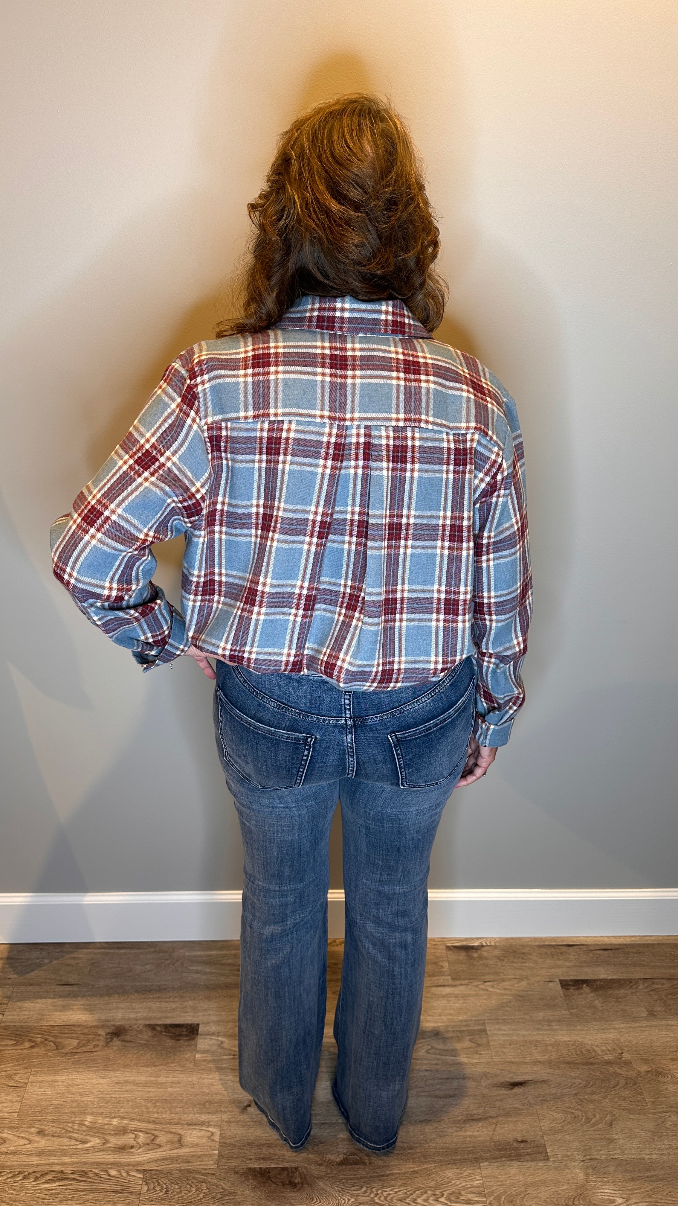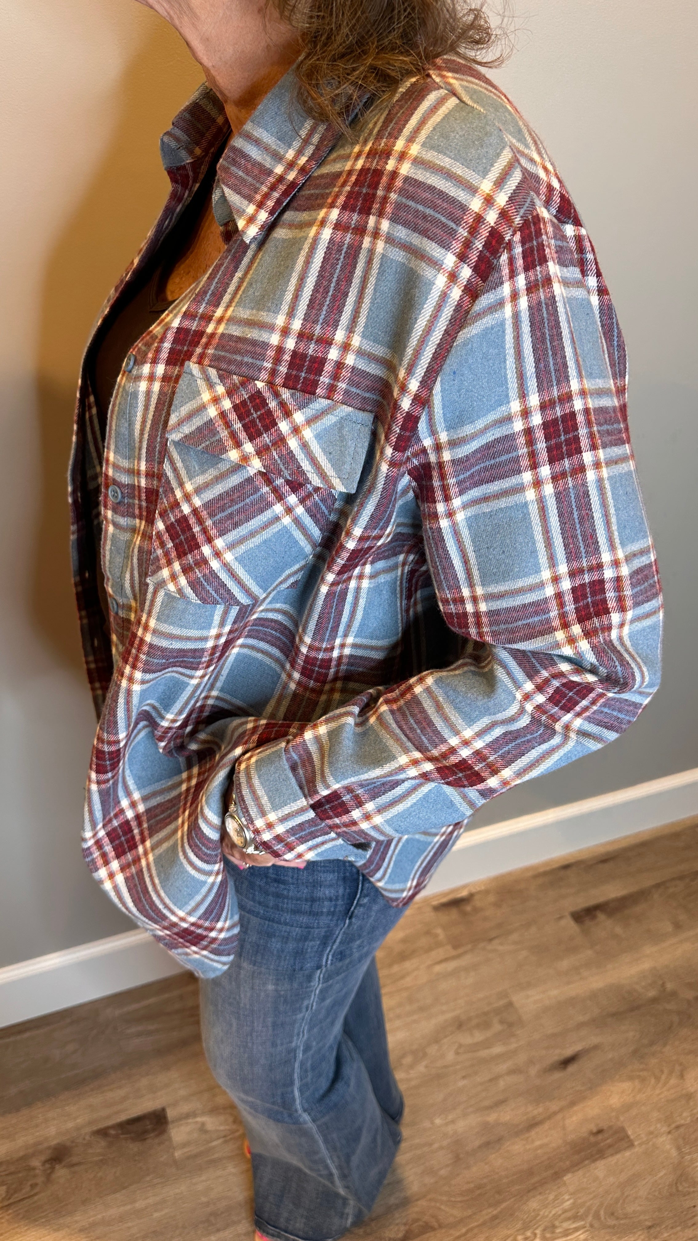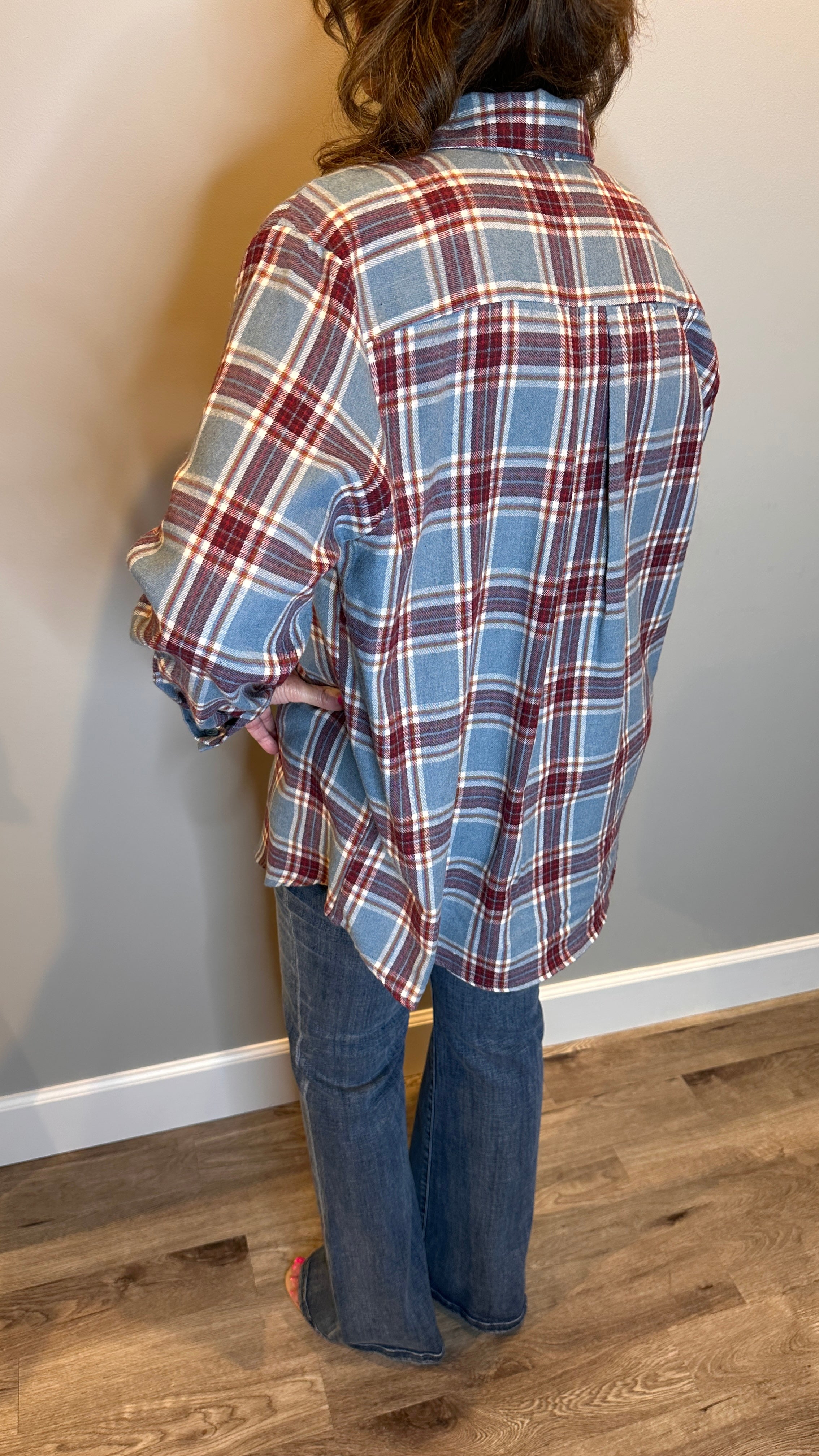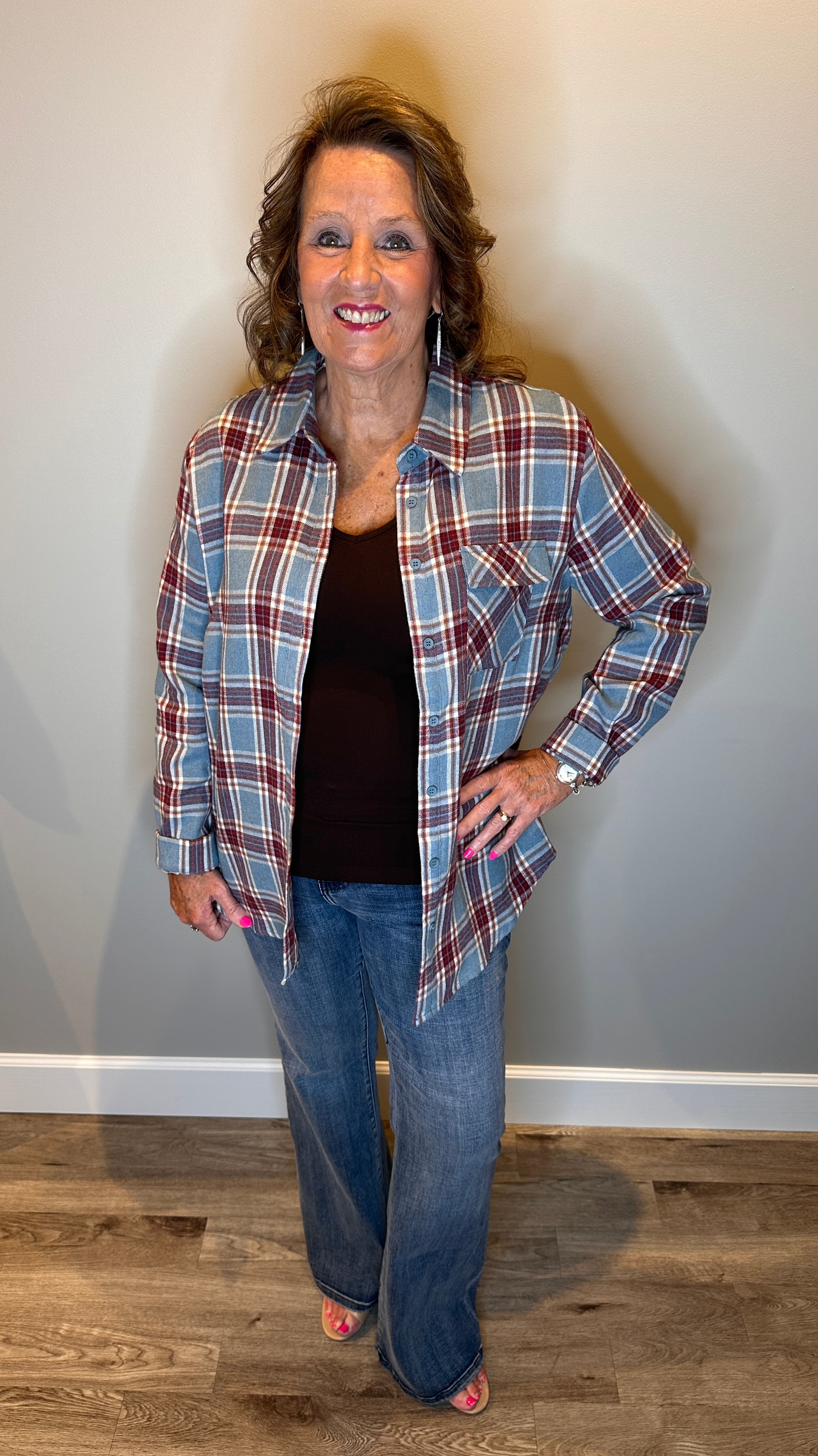 Stay cozy and stylish in this classic flannel button-up. Designed in a pretty blue and burgundy plaid, this long sleeve top features a single breast pocket and a timeless button front closure.