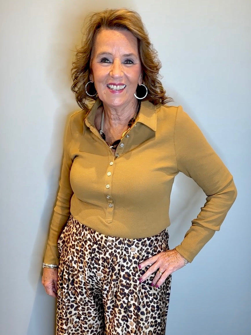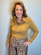 Single Rib Henley Top with Silver Button Placket and Sleeve Hem