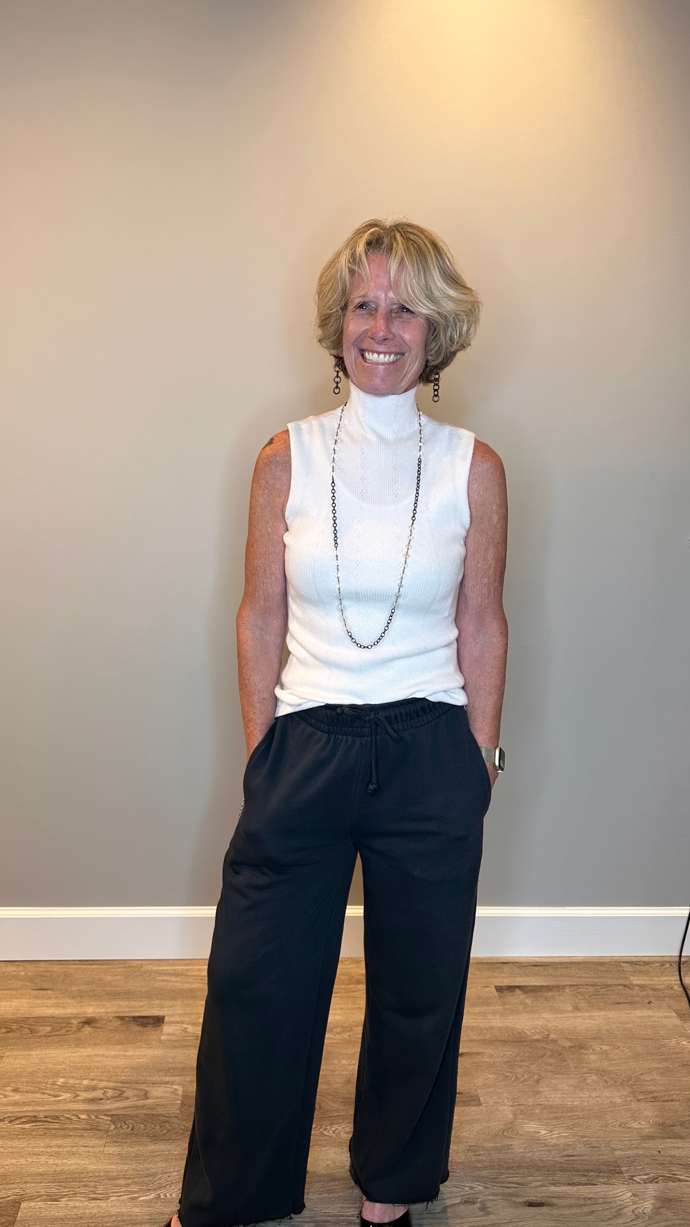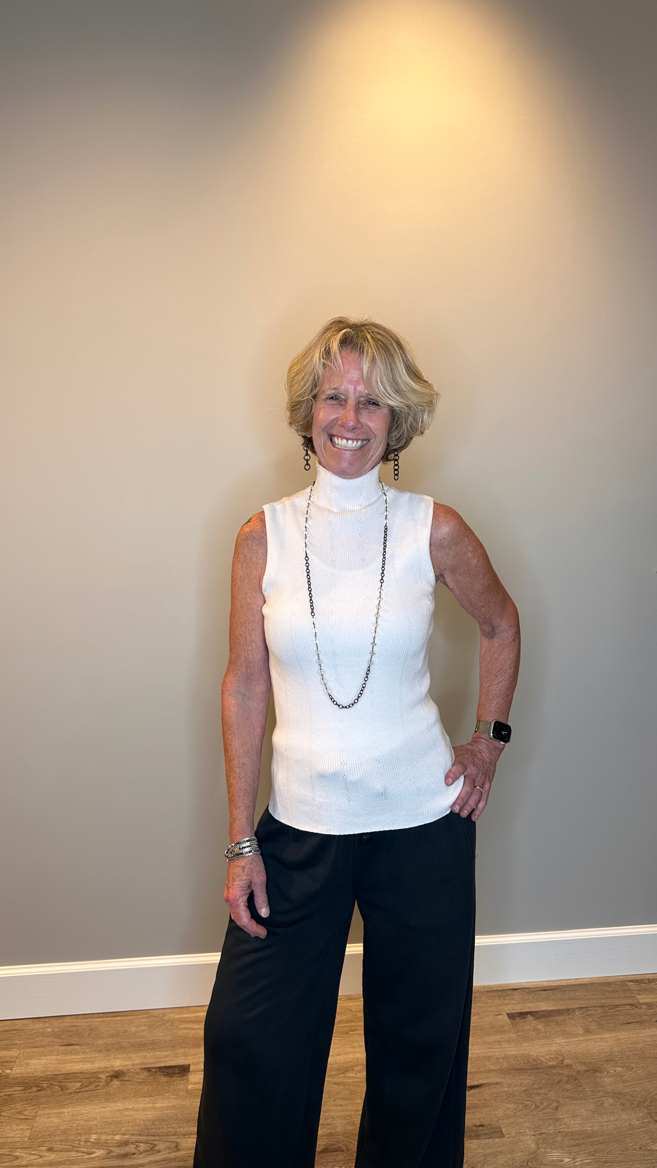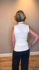 This sleeveless mock neck top in soft cream brings subtle texture with a pique pattern and a lightweight, soft feel. The look is polished yet relaxed, making it endlessly versatile.