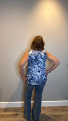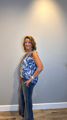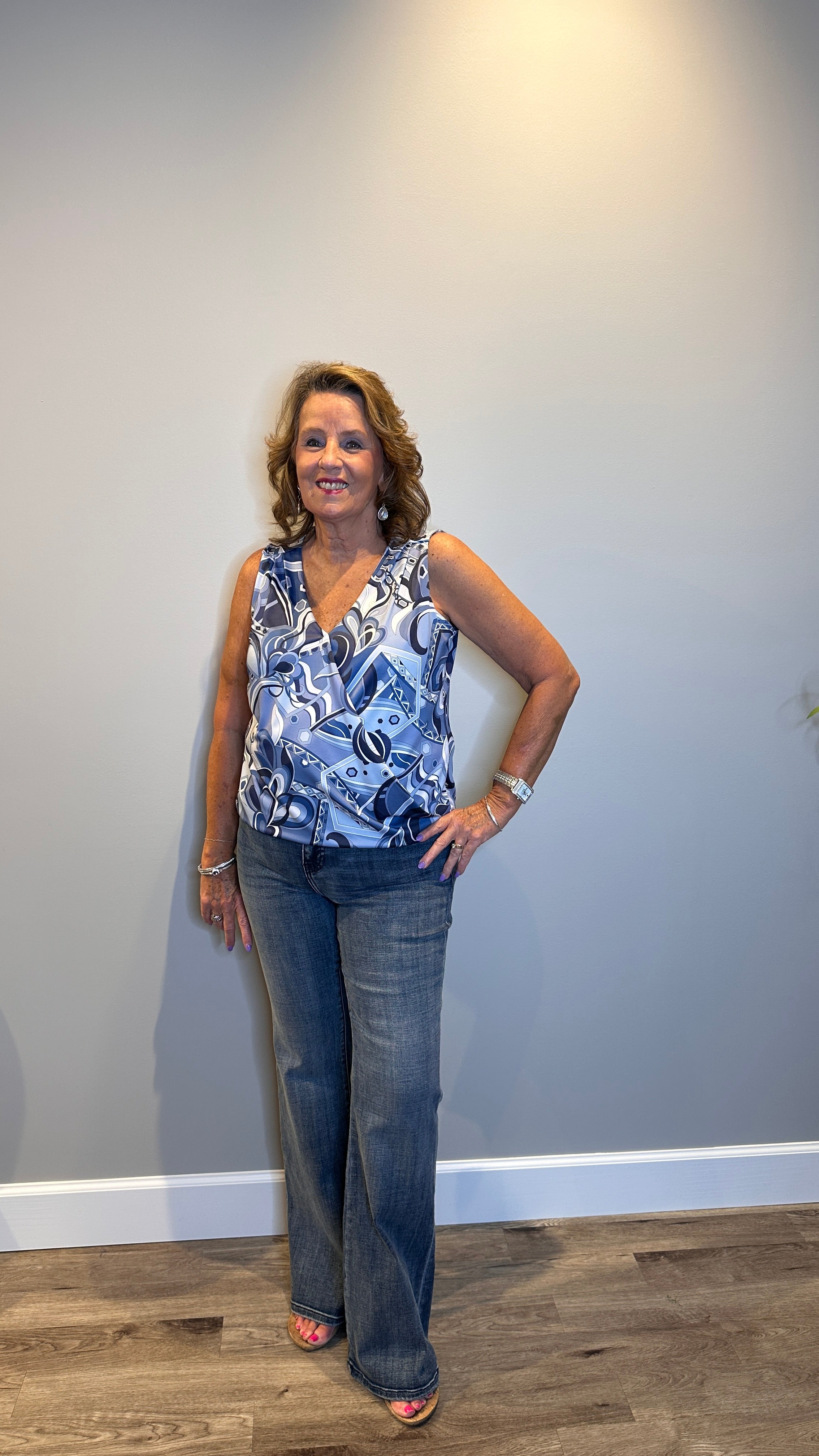 This sleeveless surplice top is designed with an easy, wrinkle-free fabric that drapes beautifully. The high-low hem adds flow and coverage, while the crossover neckline creates a flattering silhouette. The geometric print in the blue tones are denim friendly!