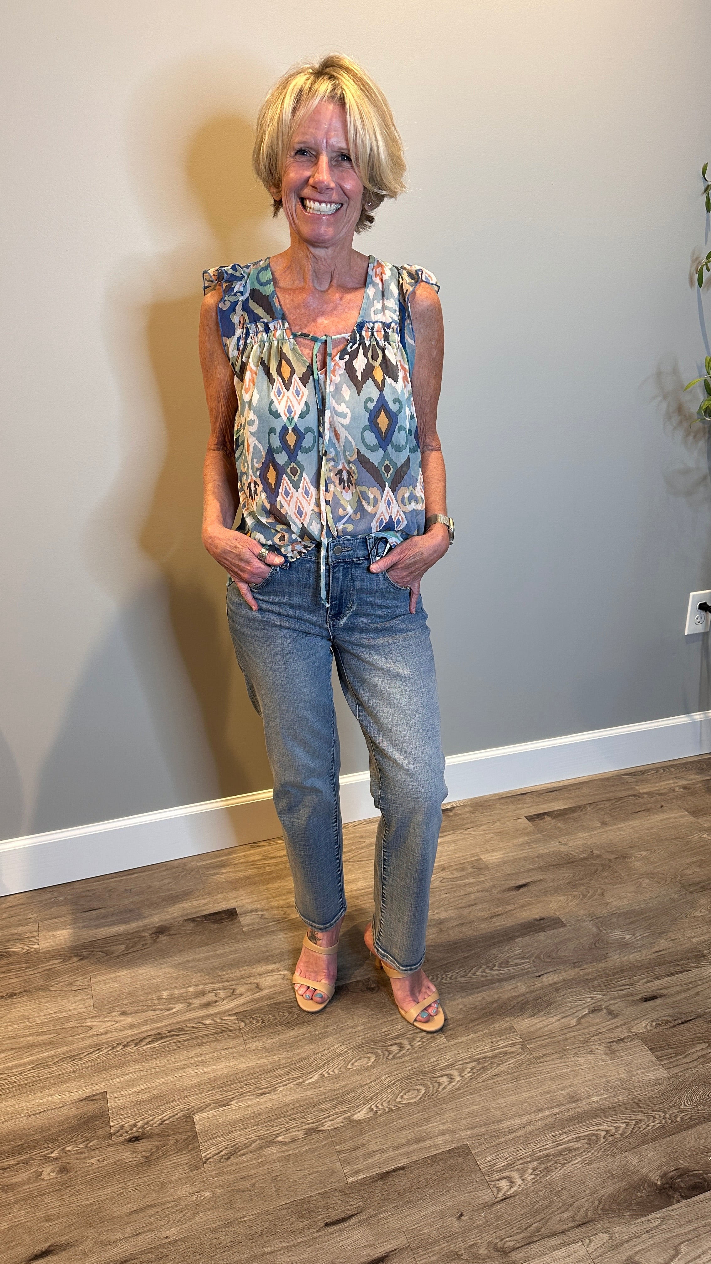 The Susan Flutter Cap Sleeve Ikat Printed Top is your new go-to for playful style! With flirty ruffle cap sleeves and delicate smocked details, it adds just the right touch of charm. The vibrant ikat print makes a bold statement, while the airy fabric keeps you cool and comfy all day. Perfect for standing out with effortless ease!