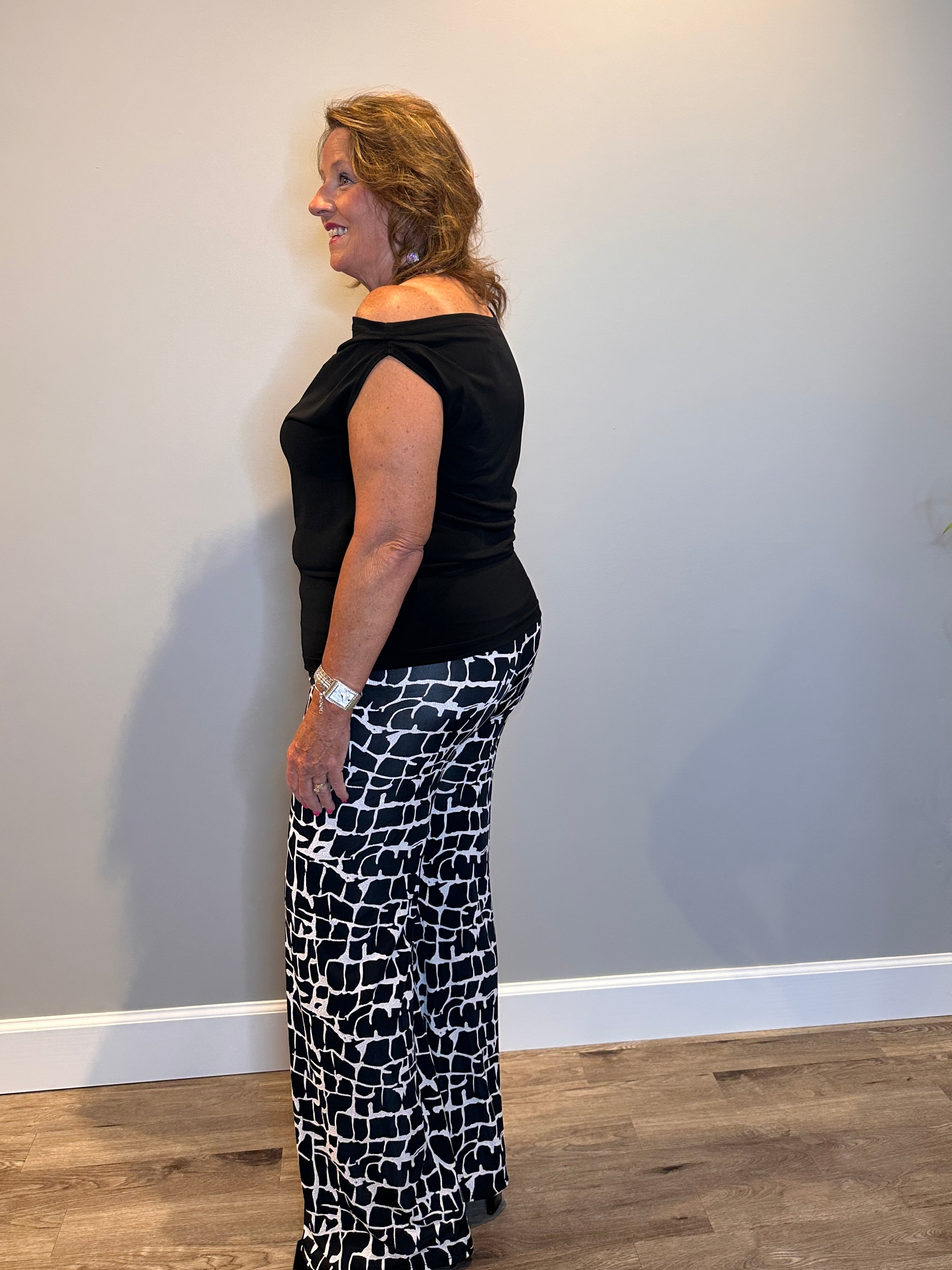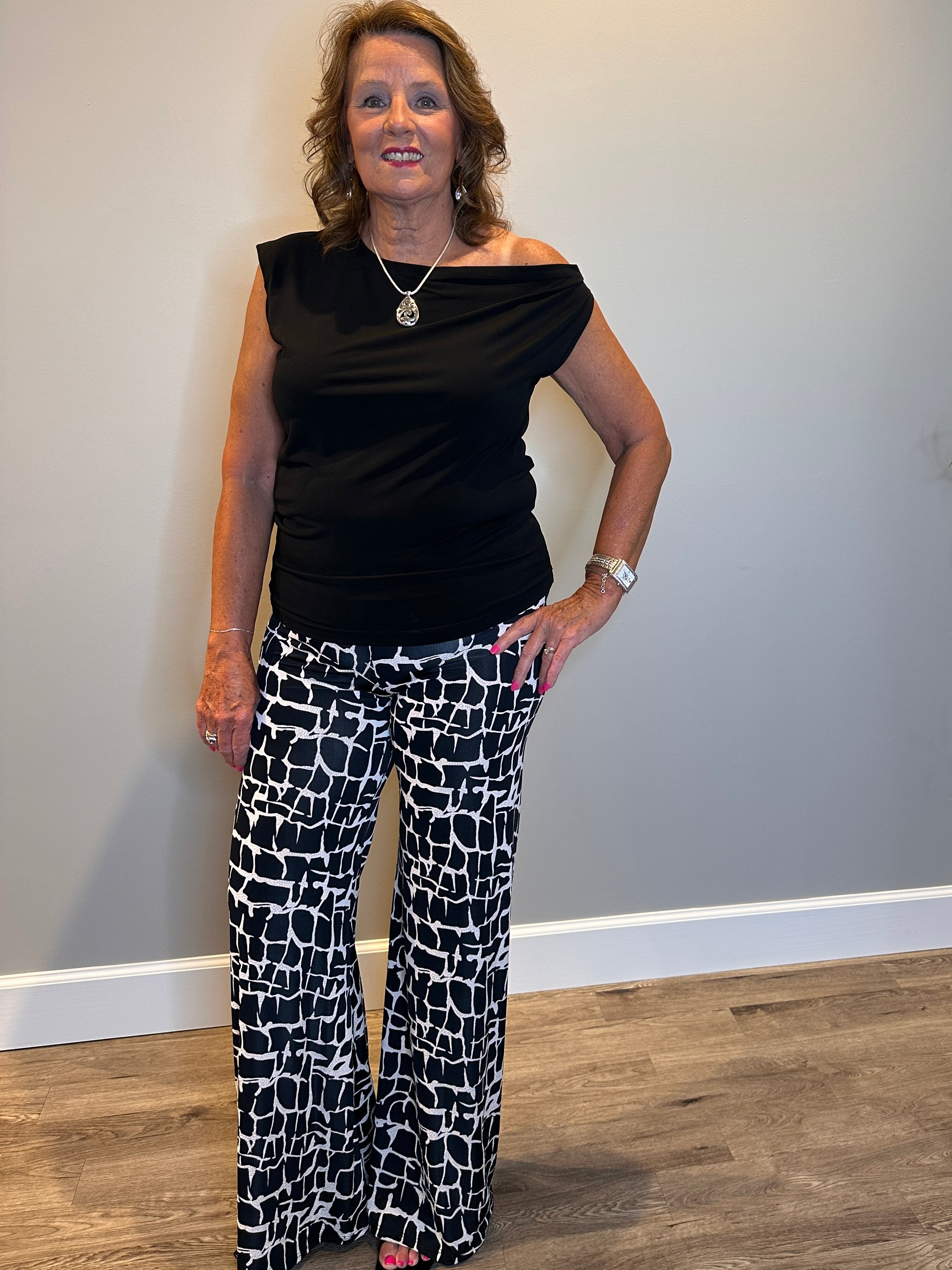 Make a statement in these wide leg palazzo pants featuring an abstract black and white pebble print with raised puff detailing. The bold positive-negative design offers modern edge while the wide waistband ensures a comfortable, flattering fit.