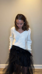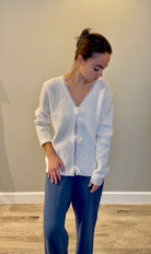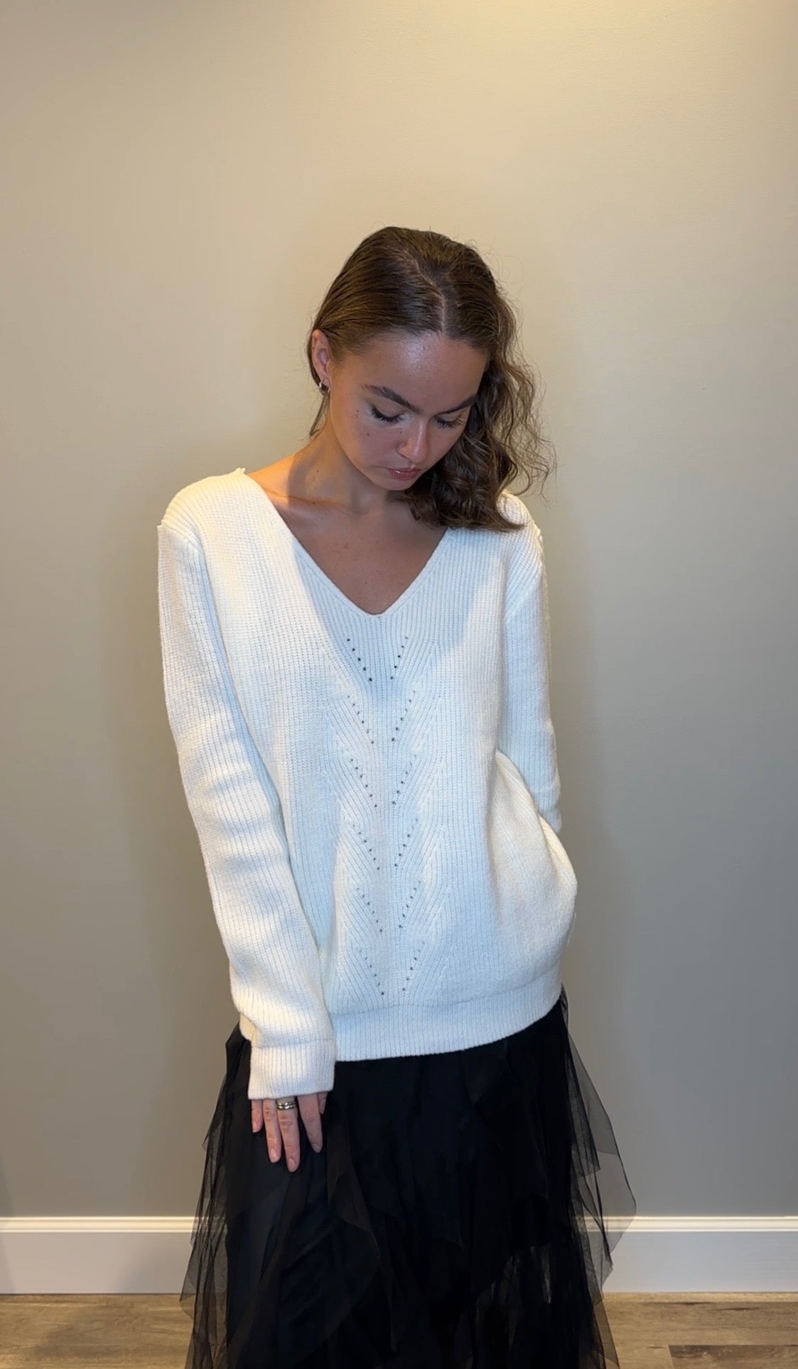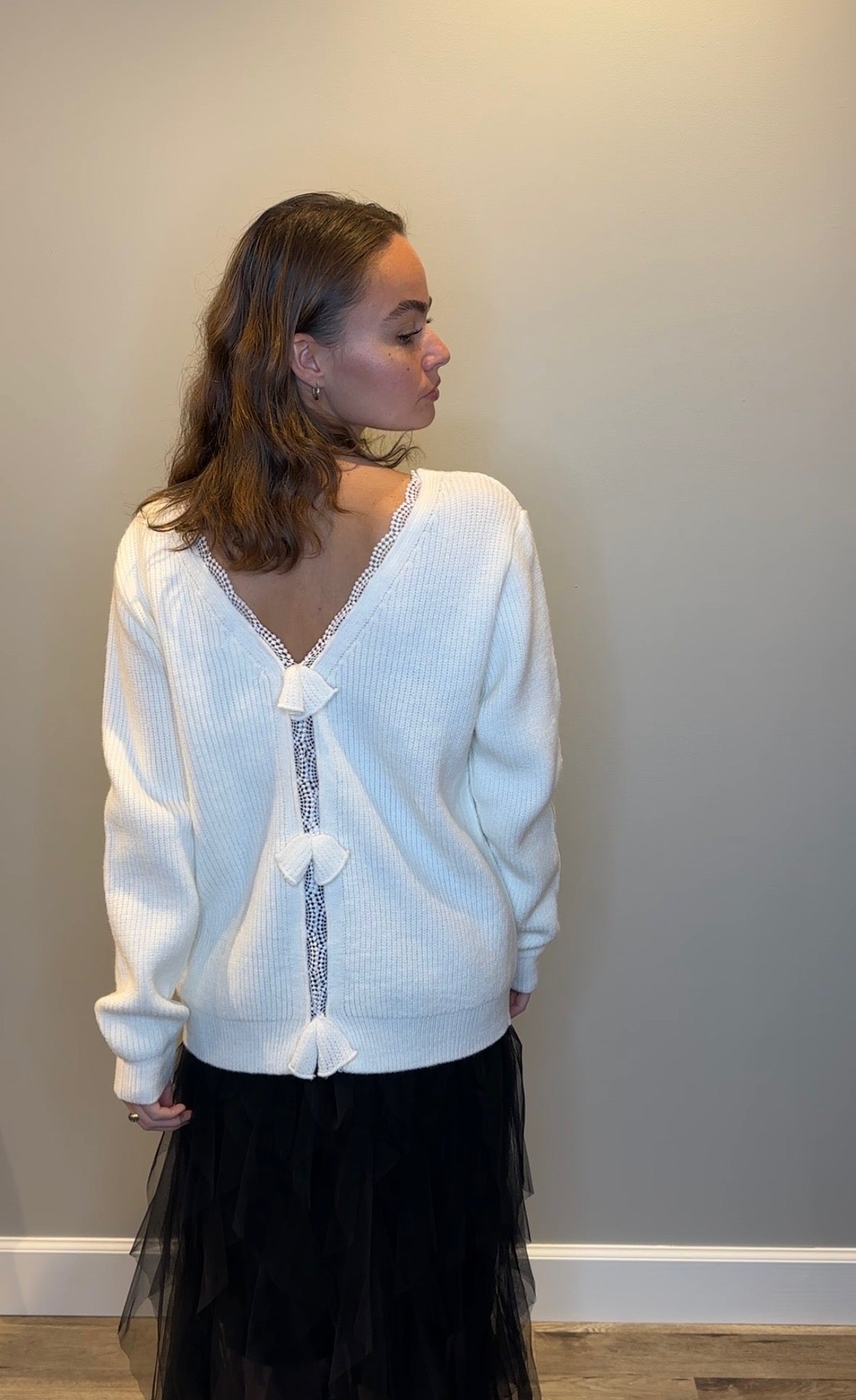 A delicate take on a classic knit, this long sleeve sweater features a back V-Neck (or can be worn in the front) accented with lace crochet edging charming bow details. The front showcases a subtle design that adds understated interest. Soft, comfortable knit makes it perfect for wearing alone, offering both elegance and ease.